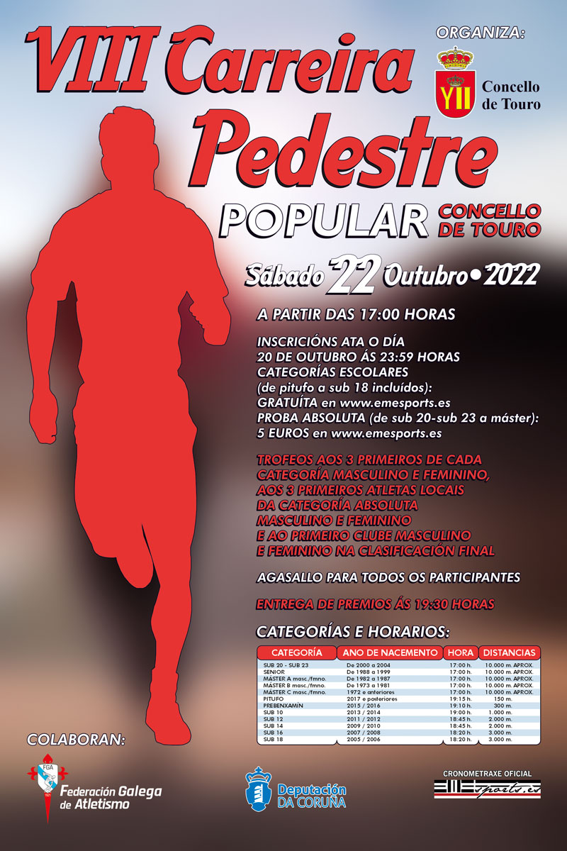 Os interesados poderán apuntarse ata o próximo xoves, 20 de outubro, ás 23.59 horas na web: www.emesports.es. A cuota para inscribirse na proba absoluta: 5 euros. E os escolares tamén poderán apuntarse en www.emesports.es. A inscripción nas categorías escolares é gratuita e o percorrido estará adaptado a cada unha das idades. Na organización da carreira, ademáis do Concello de Touro, participan Federación Galega de Atletismo e a Deputación da Coruña.
