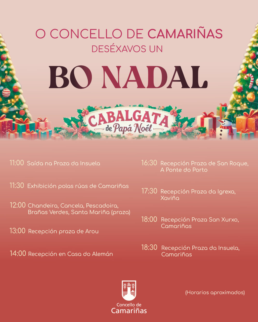 O mércores 25 de decembro Papá Noel chegará a Camariñas para visitar a todos os nenos e nenas do municipio, facendo na súa carroza unha Cabalgata única na comarca que o levará a percorrer todas as rúas do municipio.