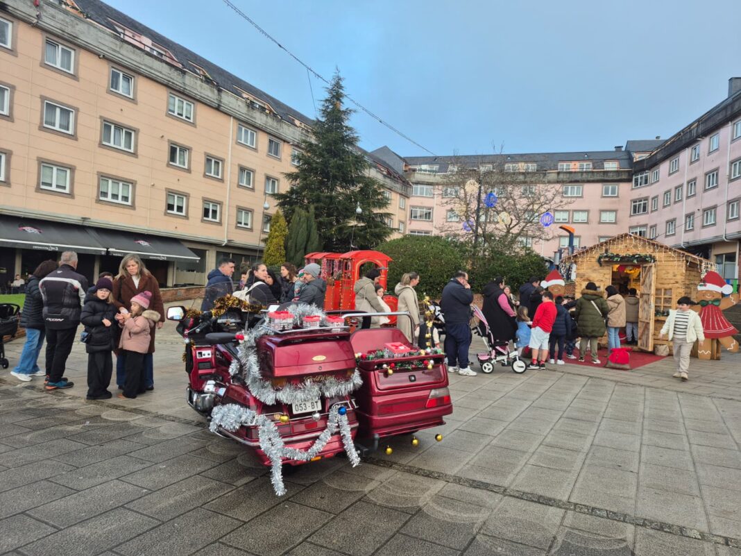 Pola mañá fixo un percorrido en moto con sidecar pola capital municipal -incluíndo unha parada xunto á escola infantil “A Galiña Azul” para saudar aos nenos usuarios dese servizo-, o que lle permitiu deixar aparcados os seus trineos durante unhas horas e o descanso dos renos na xornada previa á noite na que pasa por todas as vivendas para enchelas de agasallos e ilusión.