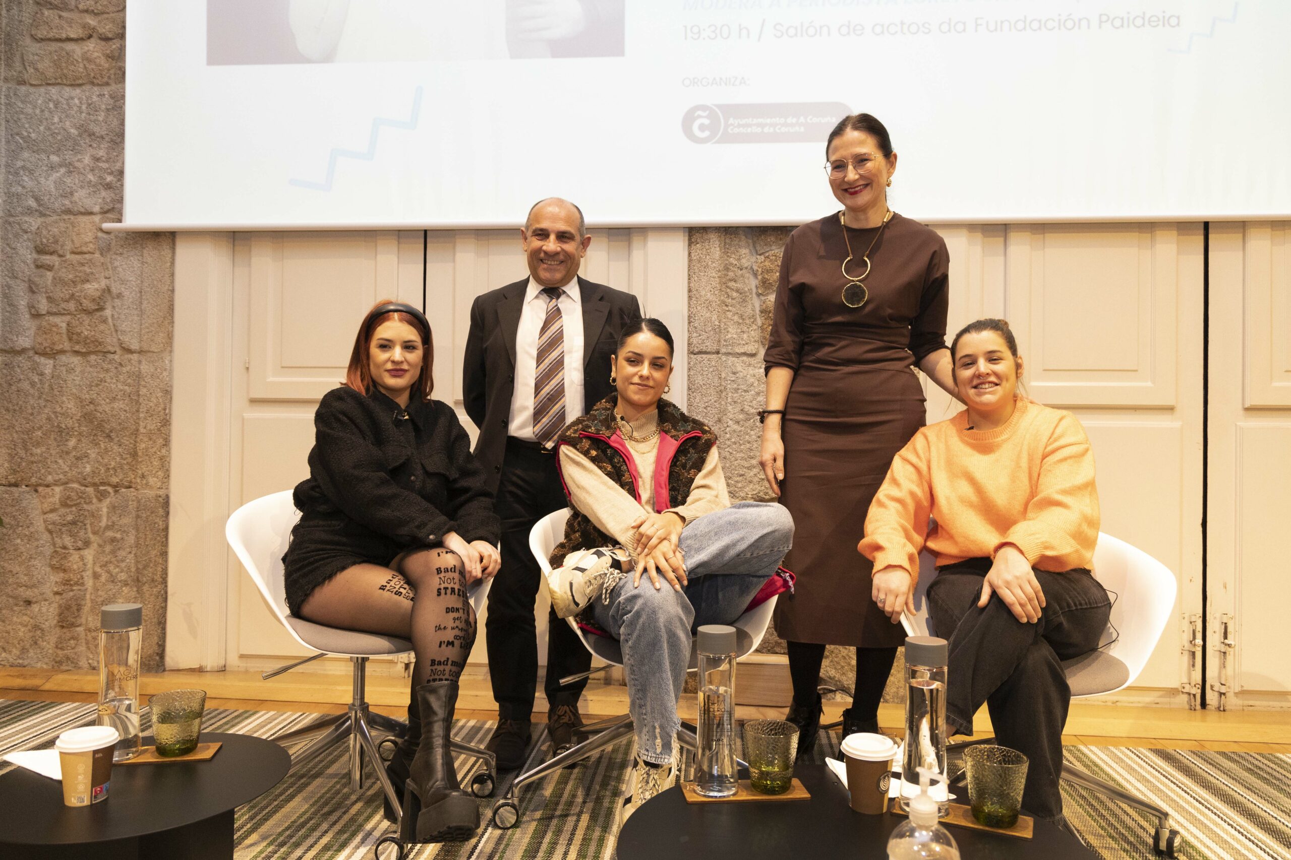 O concelleiro de Educación, Jesús Celemín, foi o encargado de presentar o trío de cantareiras nun salón de actos da Fundación Paideia que estivo ateigado de público. Moderou o acto a xornalista Loreto Silvoso. Sabela, Aida e Olaia falaron das dificultades que tiveron como mulleres para desenvolver o seu traballo musical e das necesidades que existen no seu sector para acadar unha igualdade real.