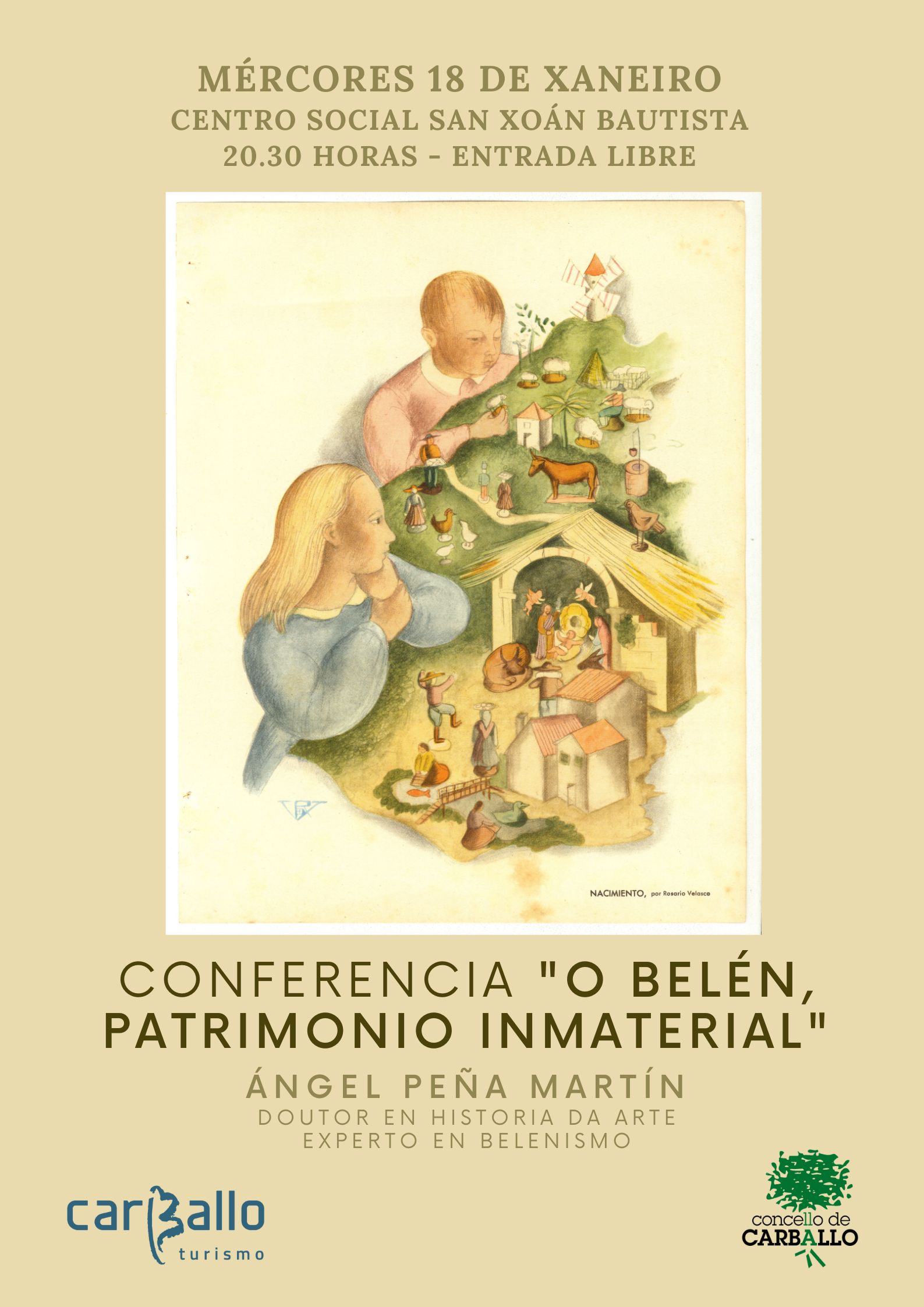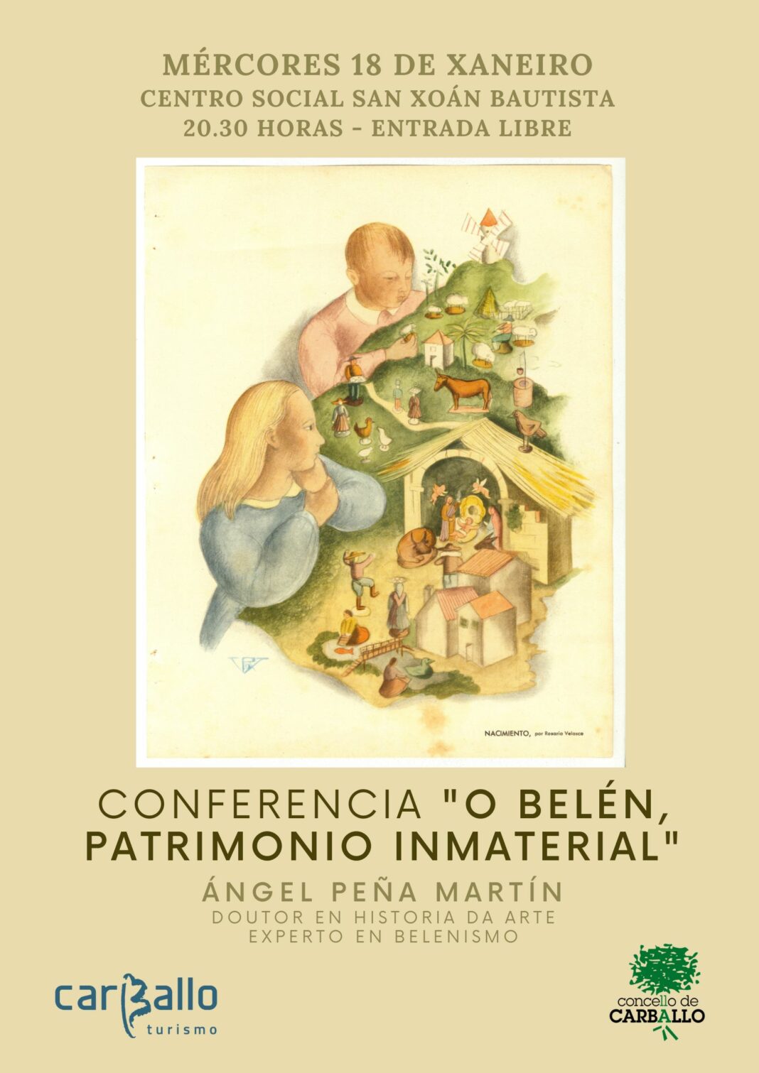 Ángel Peña participou en decembro na inauguración da exposición De Belén ao Finisterrae, que pode verse ata o día 16 no andar -1 do Pazo da Cultura (de luns a venres, de 16.30 a 20.30 horas), e este mércores 18 coroará o paso por Carballo dunha das mellores coleccións de beléns do mundo coa conferencia titulada O belén, patrimonio inmaterial. O acto celebrarase ás 20.30 horas no Centro Social San Xoán Bautista, coa colaboración da parroquia de Carballo.