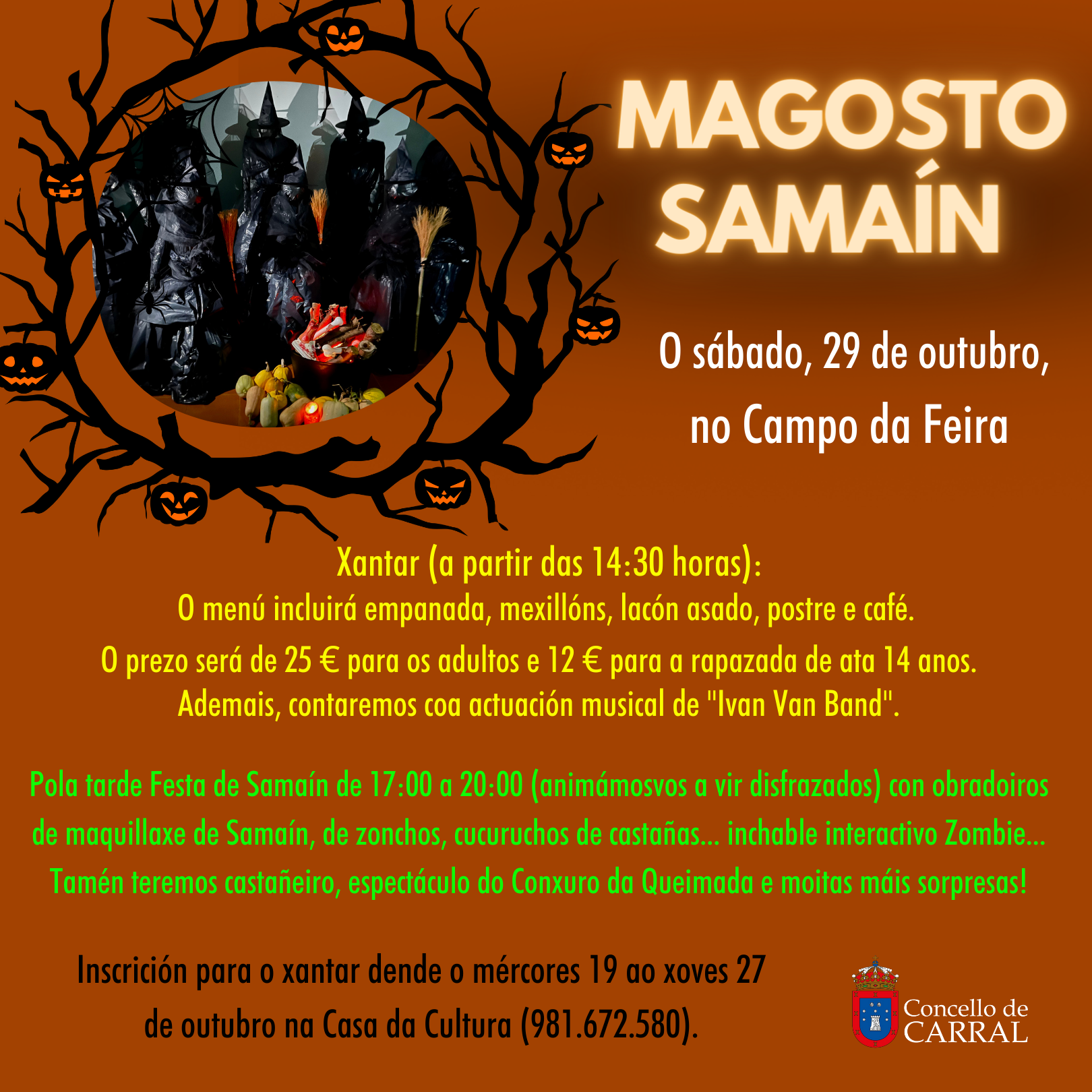 Carral teno xa todo preparado para vivir as festas do Magosto e do Samaín por todo o alto. A cita terá lugar o sábado, 29 de outubro, no Campo da Feira, e ofrecerá alternativas de lecer para veciños e veciñas de todas as idades. Deste xeito, haberá xantar, actuacións musicais e unha festa con diferentes alternativas de lecer para a rapazada.