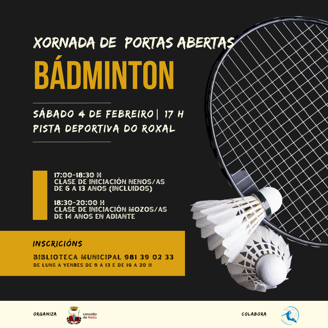O Concello de Neda celebrará unha xornada de portas abertas na que nenos e nenas, mozos e mozas e persoas adultas poderán iniciarse na práctica do bádminton. Unha disciplina deportiva con clube propio no municipio, que busca gañar alumnos e alumnas para as súas clases. Así, as xornadas terán lugar o sábado 4 de febreiro pola tarde, na pista deportiva do Roxal, e estarán guiadas polo Neda Club Bádminton. A participación é gratuíta, con inscrición previa chamando ao teléfono da Biblioteca Municipal: 981 39 02 33, en horario de 9 a 13 e de 16 a 20 h, de luns a venres -dende xa e ata o venres 3 de febreiro-.
