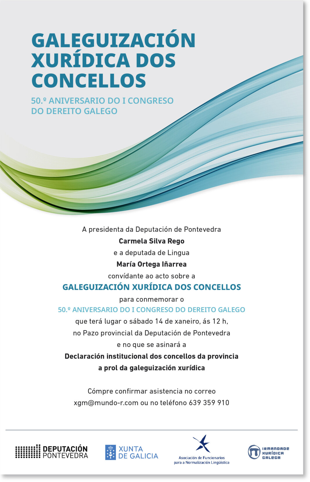 Por este motivo, e buscando “rachar coa situación e mover os marcos da lingua”, segundo di Ortega, a Deputación vén de citar aos concellos da provincia este sábado nun acto simbólico no que se pretende conmemorar tamén o 50 aniversario do I Congreso do Dereito Galego e asinar por parte das e dos alcaldes da provincia de Pontevedra unha declaración a prol da galeguización dos servizos xurídicos dos concellos, así como descubrir unha placa nun monolito nos xardíns da Deputación en lembranza de tan sinalado día.