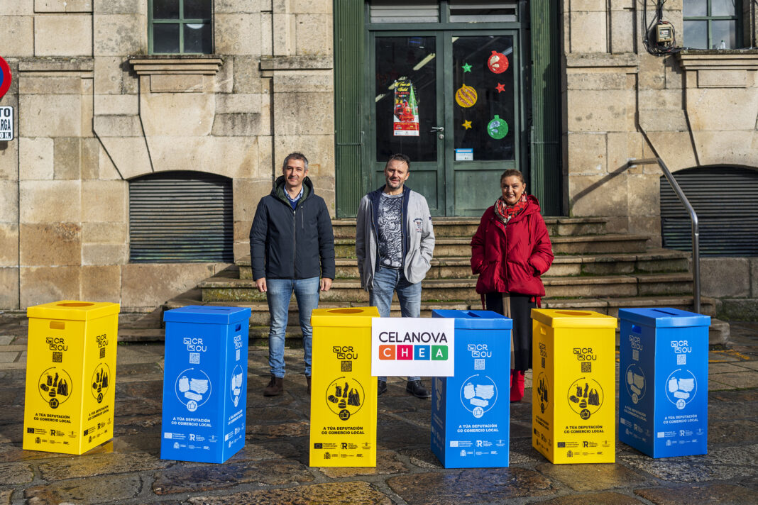 O deputado de Cooperación, Pablo Pérez, e a deputada de Reto Demográfico, Luz Doporto, visitaron Celanova para entregar os primeiros contedores do programa ao presidente da asociación de comerciantes, Francisco Villar, ao que lle agradeceron a implicación da entidade e dos asociados nesta primeira acción do programa. Pablo Pérez destacou que “a colaboración do comercio rural supón unha gran achega cara o fomento dunha nova mentalidade medioambiental”. Unhas palabras que referendou Luz Doporto sinalando que grazas a programas como este “xérase un novo sentido de responsabilidade colectiva que contribúe a reducir o impacto negativo no medio en zonas de reto demográfico”.