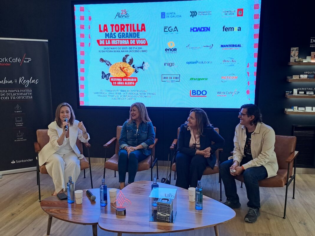 A vicepresidenta da Deputación de Pontevedra, Luisa Sánchez, participou este mércores no Work Café Santander de Vigo na presentación do festival solidario co que a asociación Alento (formada por persoas afectadas por un dano cerebral adquirido) festexará, este sábado 24 de maio en Navia, os seus 25 anos de existencia. No marco do festival realizarase a tortilla máis grande da historia de Vigo, para o que se necesitarán ingredientes como 1.700 ovos ou 150 quilos de patacas, e haberá actividades como música en directo e obradoiros educativos e creativos.