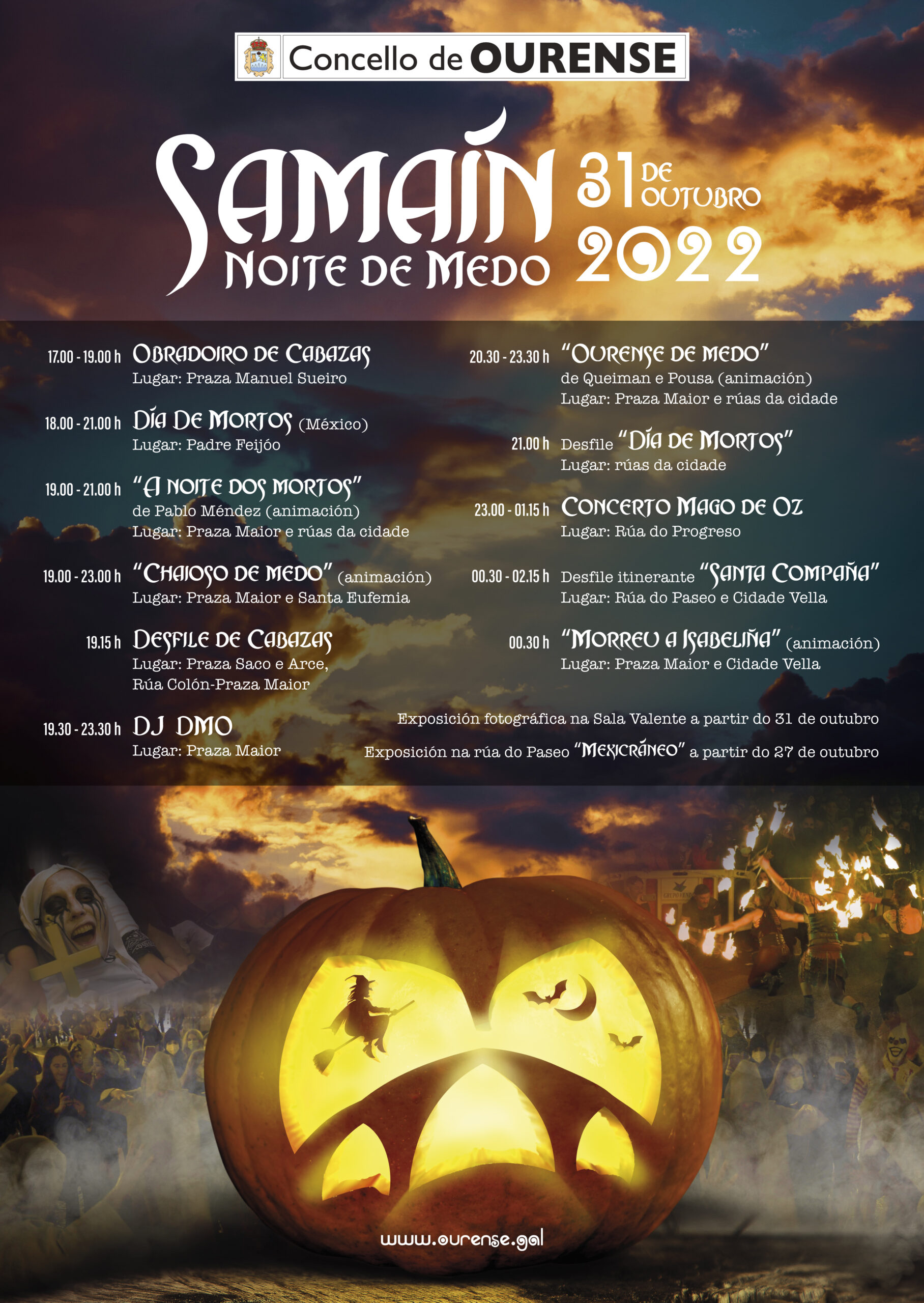 O Concello reforza este ano a programación do Halloween, que incluirá, este 31 de outubro, actividades como a escenificación do Día de mortos de México, espectáculos de animación a cargo de Pablo Méndez, Chaioso de medo, animación de Queiman e Pousa ou “Morreu a Isabeliña”, os desfiles de cabazas, do Día de Mortos e da Santa Compaña, animación musical de DJ na Praza Maior e un gran concerto co grupo Mago de Oz, na rúa do Progreso. O programa complétase cunha exposición fotográfica na Sala Valente a partir do 31 de outubro e a exposición “Mexicráneo”, no Paseo, desde o 27.