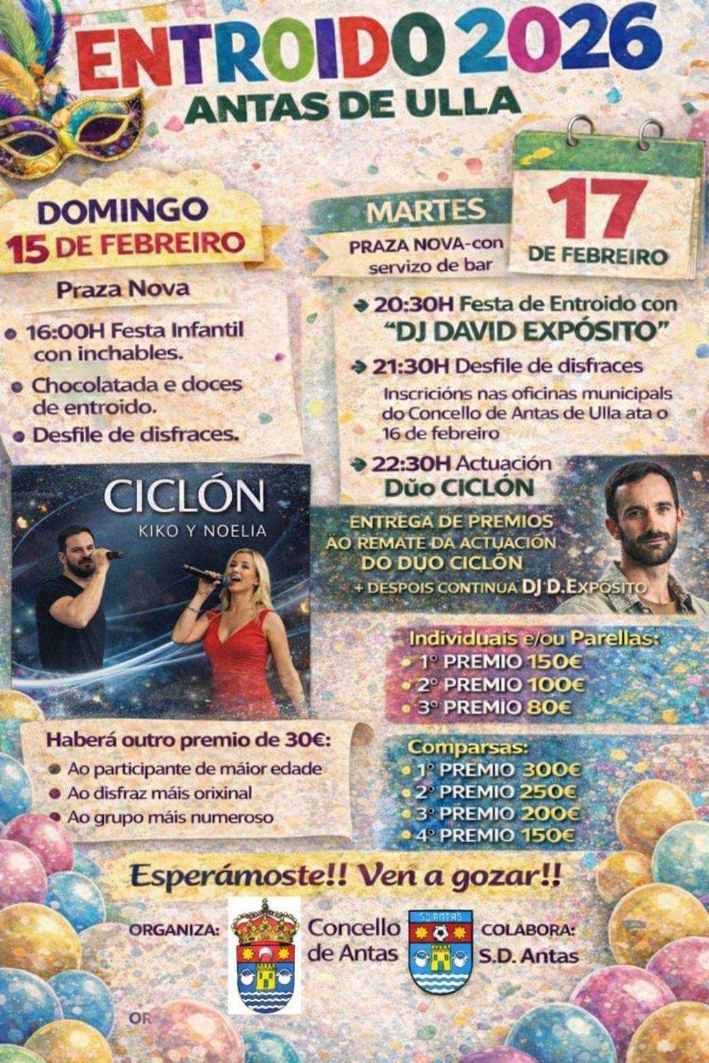 O Concello de Antas de Ulla presenta a programación do Entroido 2026, unha das citas festivas máis destacadas do calendario local, que se desenvolverá os días domingo 15 e martes 17 de febreiro na Praza Nova, cunha proposta pensada para público de todas as idades.