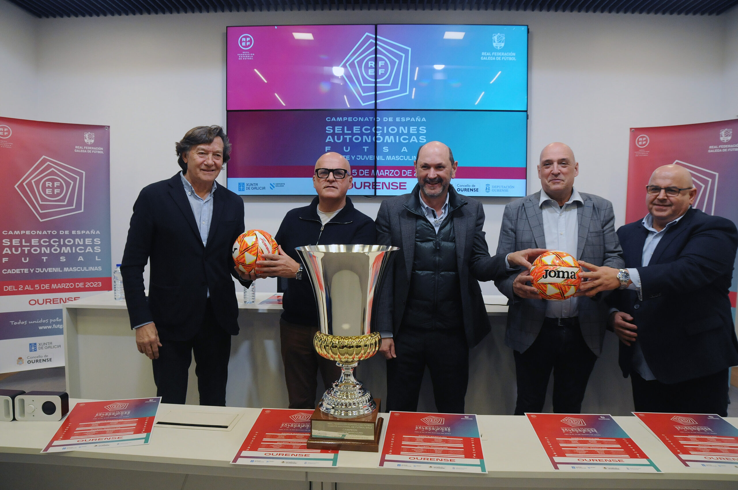 A cidade de Ourense acollerá do día 2 ao 5 de marzo o Campionato de España de seleccións autonómicas de fútbol sala, nas categorías cadete e xuvenil masculina. Esta mañá, no Pazo Provincial, tivo lugar a presentación do torneo, na que participou o tenente de alcalde do Concello de Ourense, Armando Ojea, xunto co presidente da Deputación de Ourense, Manuel Baltar, o secretario xeral para o Deporte, José Ramón Lete Lasa e o presidente da Real Federación Galega de Fútbol, Rafael Louzán. Concello de Ourense, Deputación e Xunta de Galicia colaboran na organización deste evento, que se desenvolverá en dous escenarios: o pavillón municipal dos Remedios e o Pazo dos Deportes Paco Paz.