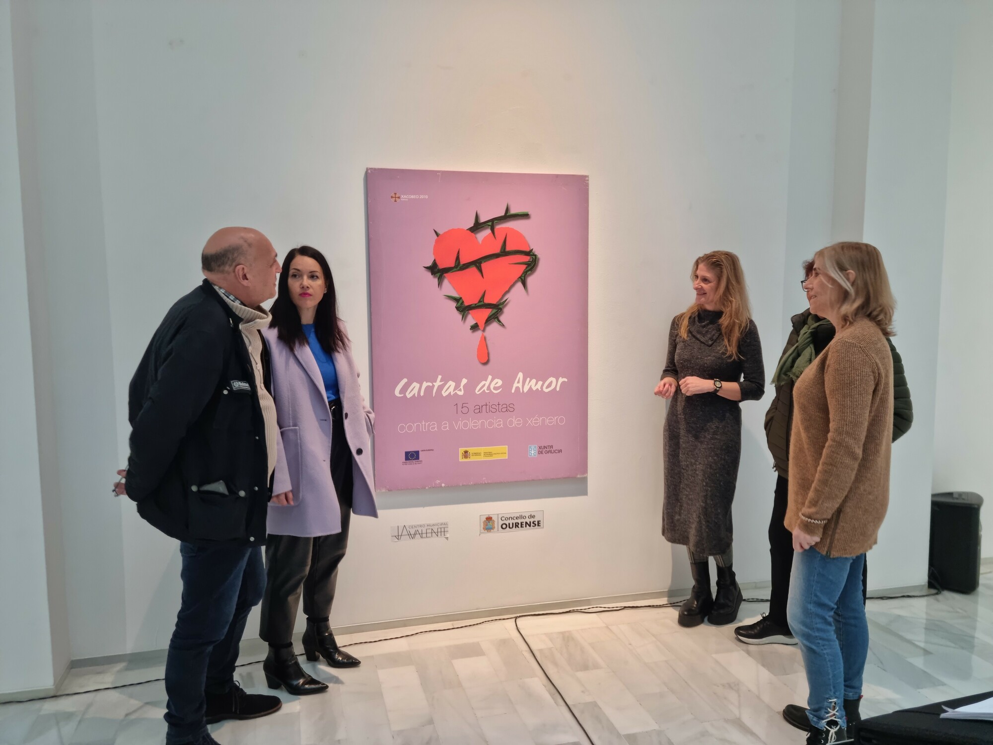 A Sala Valente acolle desde hoxe a exposición “Cartas de amor: 15 artistas contra a violencia de xénero”, organizada pola Concellería de Igualdade do Concello de Ourense, coa colaboración da Secretaría Xeral de Igualdade, a Federación Galega de Municipios e Provincias e a Concellería de Artes e Festexos. O tenente de alcalde, Armando Ojea, asistiu á apertura da mostra, incluída no programa de actividades deseñado polo Concello para celebrar o 25-N, Día Internacional para a eliminación da violencia contra as mulleres.