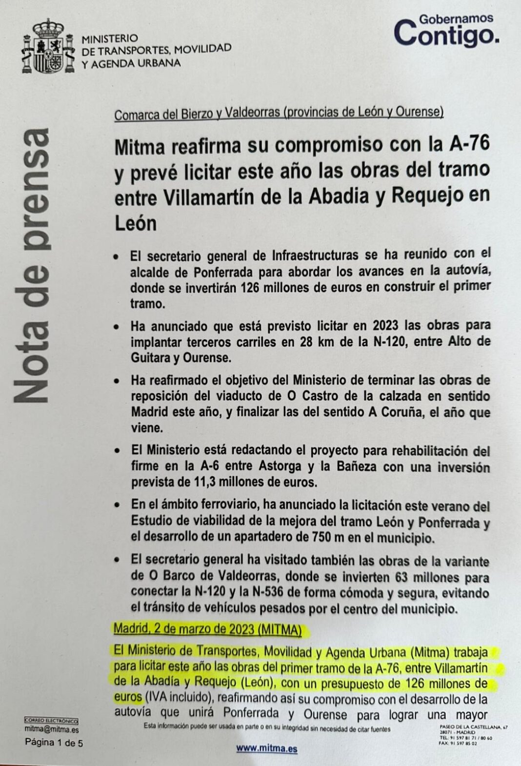 A nota oficial difundida dicía: “O Ministerio de Transportes, Movilidad e Axenda Urbana (Mitma) traballa para licitar este ano as obras do primeiro tramo da A-76, entre Villamartín da Abadía e Requejo (León), cun orzamento de 126 millóns de euros (IVE incluído)”