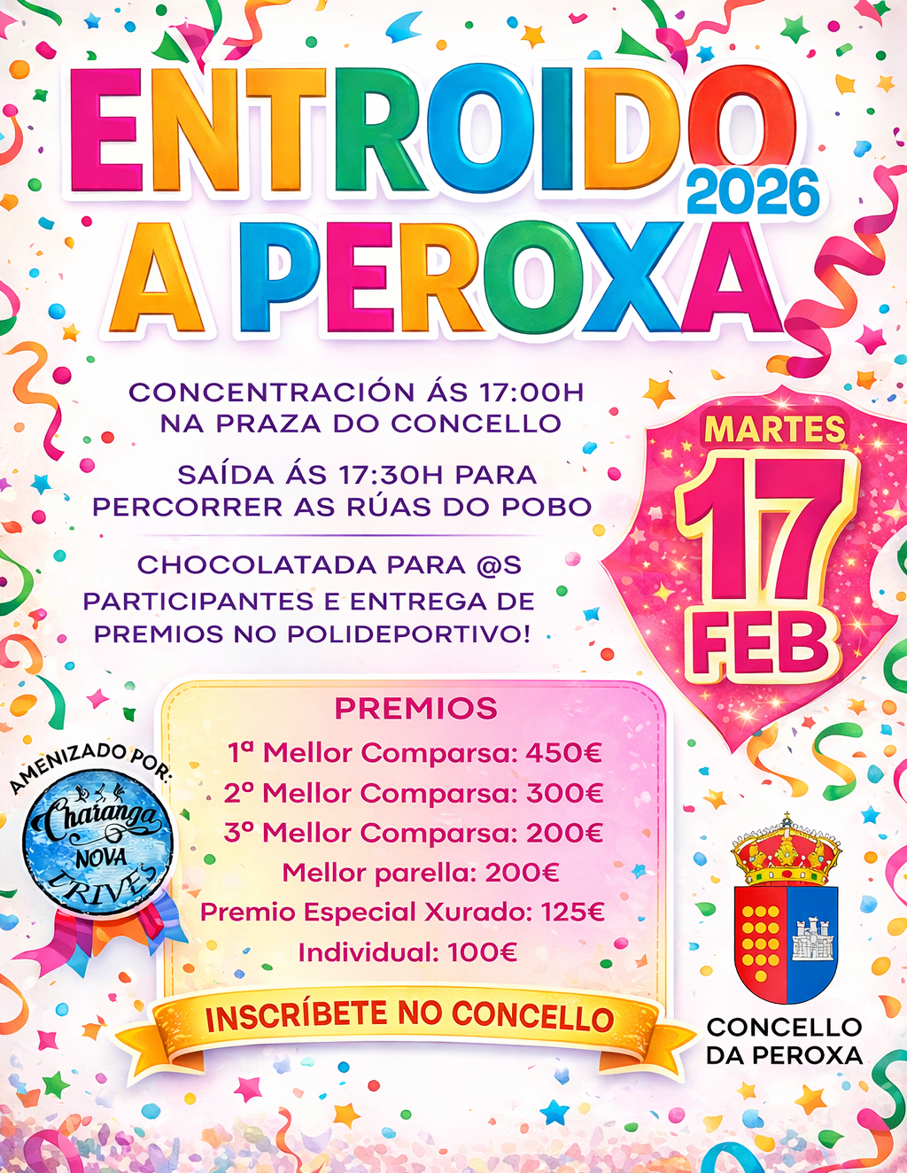 O Concello da Peroxa celebrará o Entroido 2026 o martes 17 de febreiro, cun desfile de disfraces que dará comezo ás 17:00 horas desde a Praza do Concello, amenizado pola Charanga Nova Trives. O concurso está aberto á participación de persoas de todas as idades, sexan ou non do municipio, sendo obrigatorio desfilar para optar aos premios. Establécense tres categorías: individual, parella e comparsas.