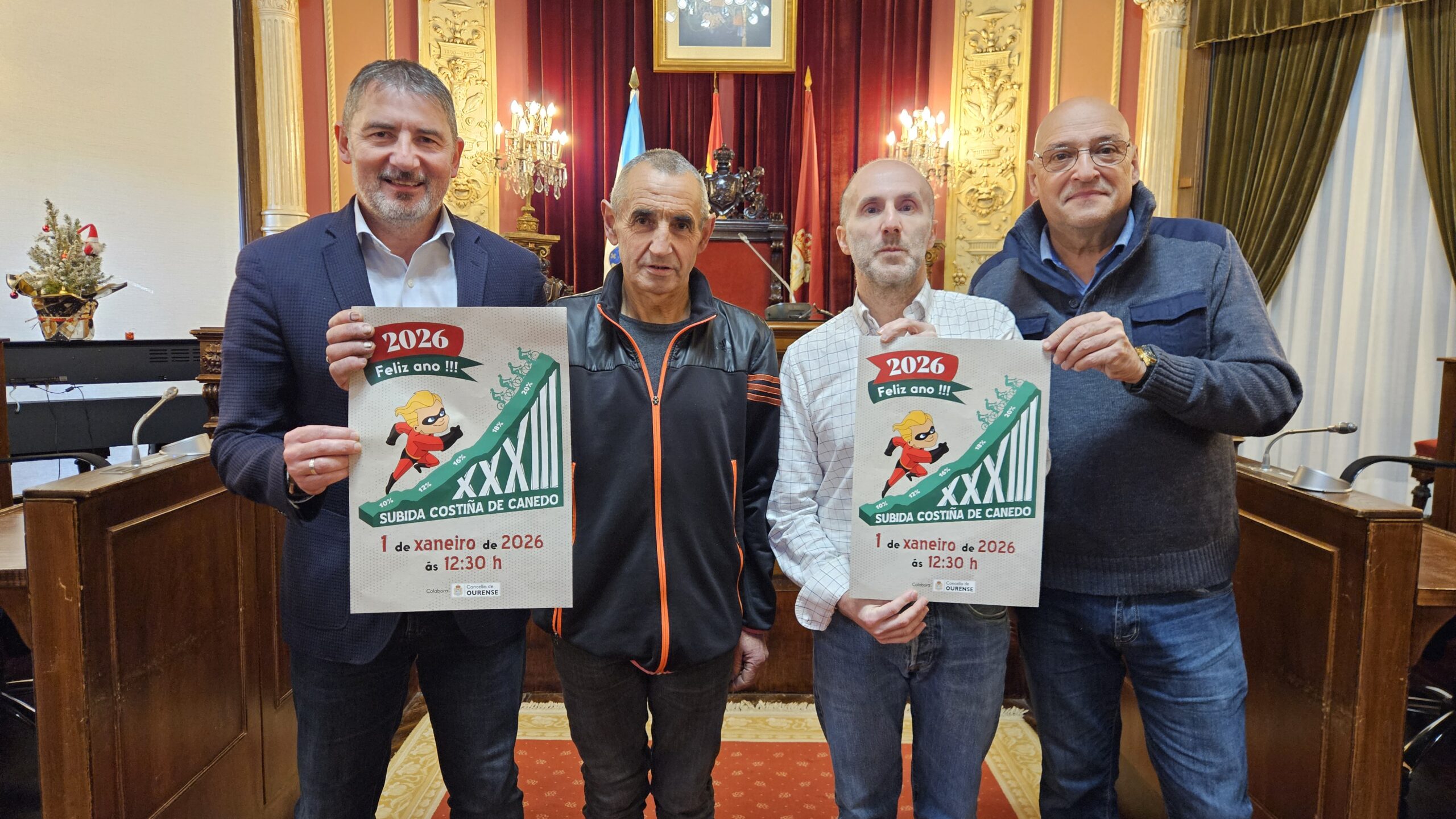 O alcalde de Ourense, Gonzalo Pérez Jácome, xunto cos concelleiros Aníbal Pereira e Armando Ojea, acompañaron esta mañá no Salón de Plenos a Saturnino González Novoa para presentar oficialmente a 33ª edición da Subida á Costiña de Canedo. Esta emblemática cita supón o arranque oficial do calendario deportivo da cidade para o novo ano.