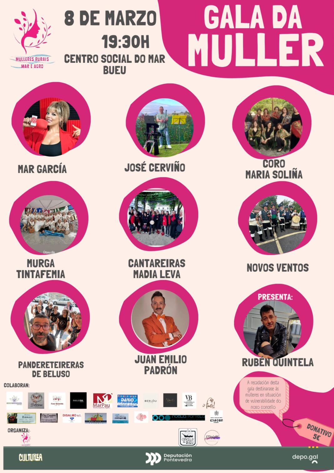 A gala comezará ás 19.30 horas e contará coas actuacións musicais de Mar García, José Cerviño, Coro María Soliña, Murga Tinta Femia, Cantareiras Madia Leva, Novos Ventos, Pandereteiras Quinta Ferreña de Beluso e Juan Emilio Padrón, mentres que Rubén Quintela será o presentador. As entradas custarán 5.00 € e a recadación desta gala destinarase a mulleres en situación de vulnerabilidade do noso concello a través do Centro de Información ás Mulleres e en forma de vales de compra.