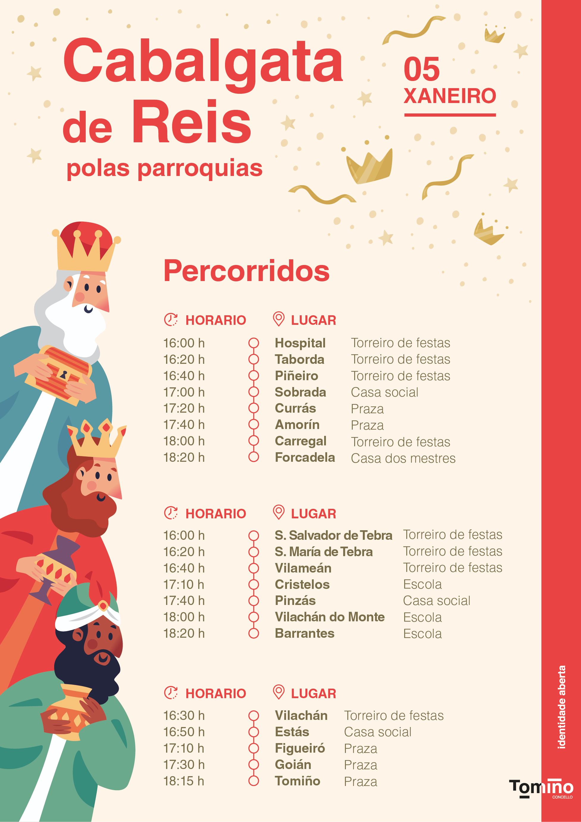 A comitiva comezará ás 16.00 horas en distintos puntos do Concello e rematará ás 18.15 horas horas na Praza do Seixo, onde se celebrará a recepción dos cativos e cativas aos Reis Magos e terá lugar o sorteo de premios. Para asegurarse de que toda a veciñanza goza desta tarde festiva, as diferentes treboadas do Concello amenizarán as rúas con música dende ás 17:00 horas.