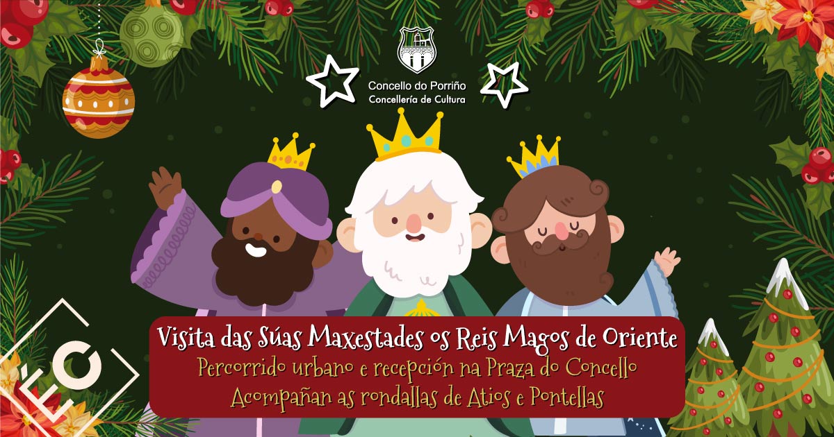 O Concello do Porriño ten o pracer de anunciar a visita das Súas Maxestades os Reis Magos de Oriente. Melchor, Gaspar e Baltasar chegarán ao Porriño en camello o día 5 de xaneiro. Irán acompañados dun enorme séquito formado polos seus paxes reais, a rondalla de Atios, a rondalla de Pontellas, o Tren do Nadal, os seus amigos da Patrulla Canina e moitos persoaxes que farán as delicias dos máis pequenos e pequenas na noite máis máxica do ano.