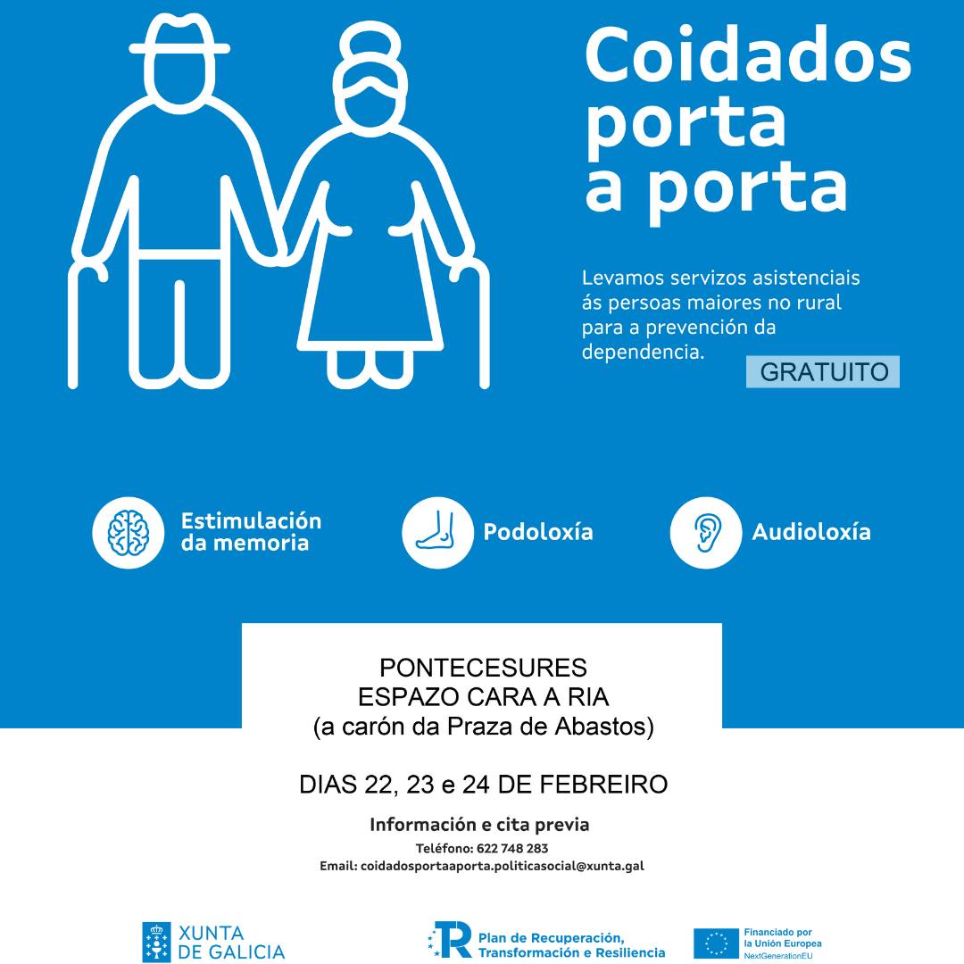 O Espazo Cara a Ría de Pontecesures (a carón da praza de Abastos) acollerá do 22 ao 24 de febreiro o autobús do programa “Coidados Porta a Porta”, unha iniciativa da Xunta de Galicia para ofrecer servizos gratuítos de podoloxía, audioloxía e estimulación da memoria ás persoas maiores. Para poder participar só é preciso solicitar cita previa no teléfono 622 748 283 ou a través do correo electrónico coidadosportaporta.politicasocial@xunta.gal.