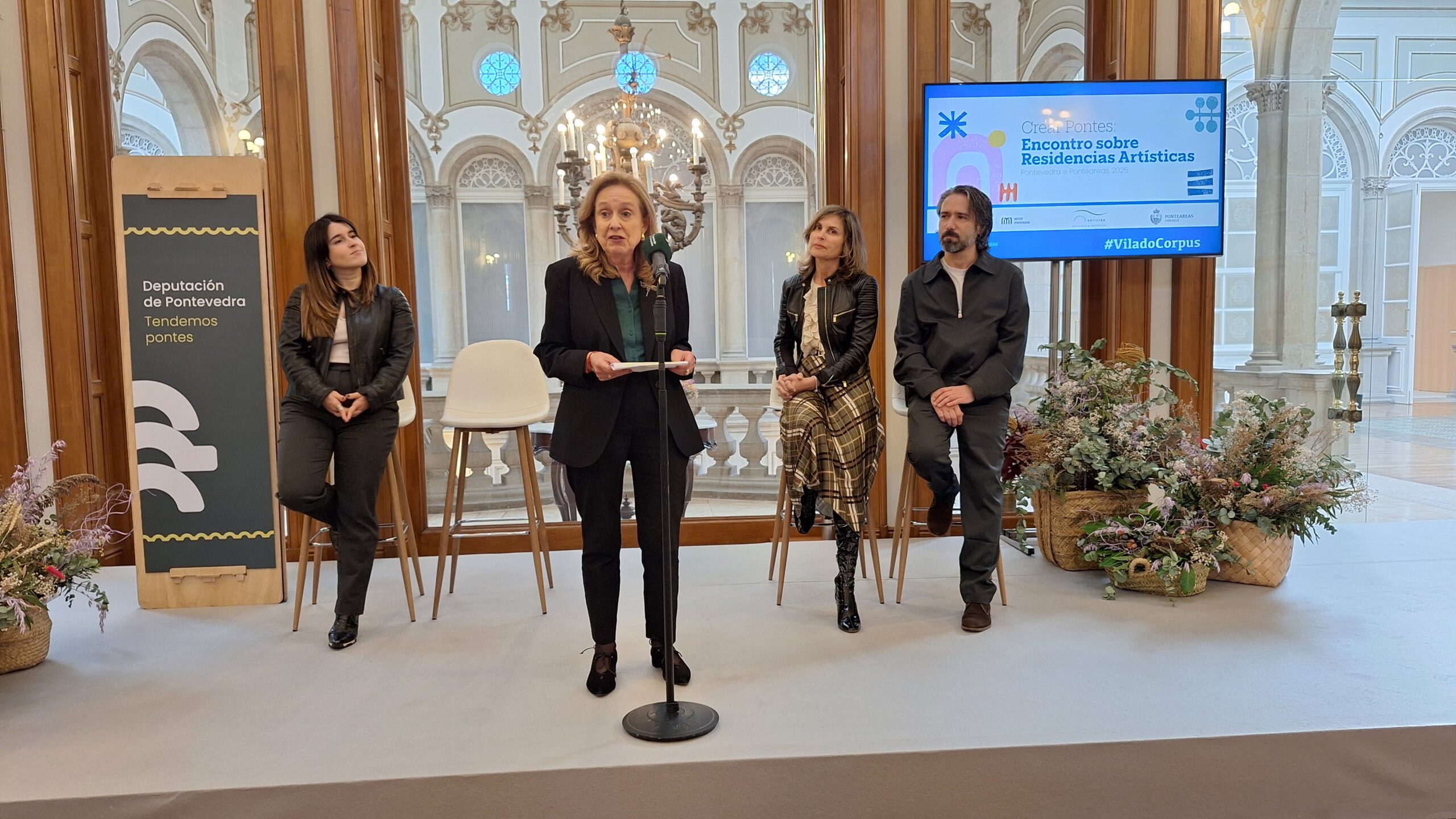 Este proxecto foi presentado hoxe no Pazo provincial pola directora do Museo de Pontevedra, Ángeles Tilve, a alcaldesa de Ponteareas, Nava Castro, a concelleira de Emprendemento de Ponteareas, Silvia Fernández Táboas, e o coordinador do encontro, Diego Parajó. Ángeles Tilve expuxo a importancia que nos últimos anos cobraron as residencias artísticas: “Trátase dun formato que favorece a reflexión, a experimentación e o intercambio, xa que grazas a elas, as e os artistas teñen a oportunidade de investigar, conectar con novos contextos, establecer vínculos profesionais e comunitarios, e desenvolver proxectos que, doutra maneira, serían difíciles de levar a cabo”.