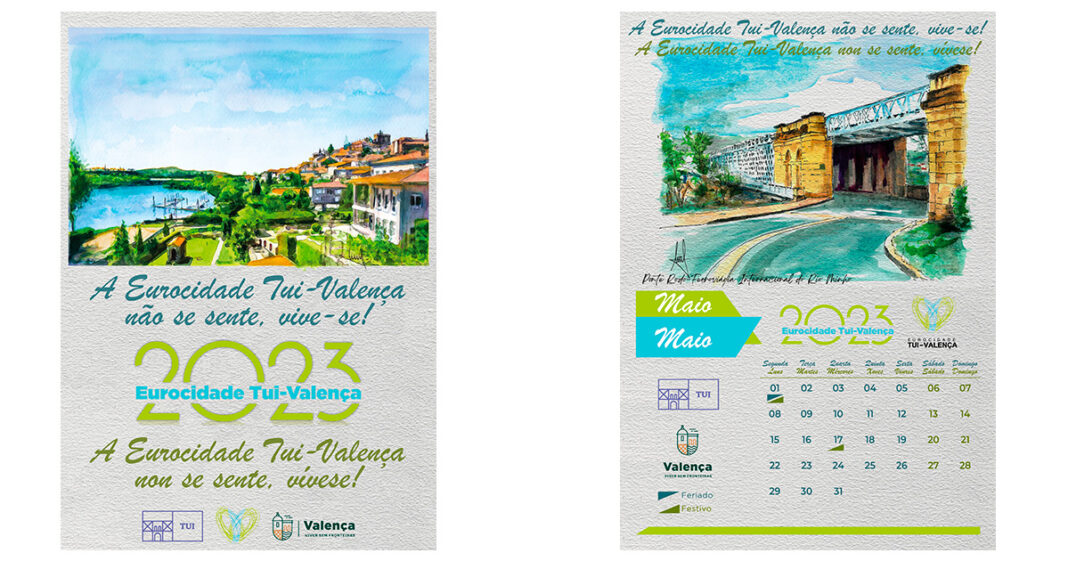 A Eurocidade Tui-Valença edita un ano máis o seu calendario ilustrado con diferentes lugares das dúas cidades pintados polo artista portugués Antonio Nunes. Baixo o lema ‘A Eurocidade Tui-Valença non se sente, vívese!’ recóllense os principais monumentos e lugares emblemáticos das cidades para este calendario do 2023.