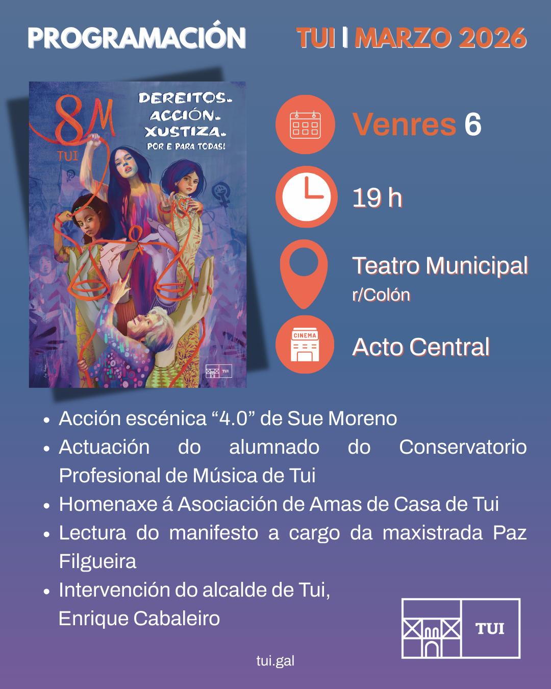 Este acto central da programación do 8M co lema “Dereitos. Acción. Xustiza. Por e para todas1” comezará ás 19 h no Teatro Municipal, con entrada libre até completar o aforo.