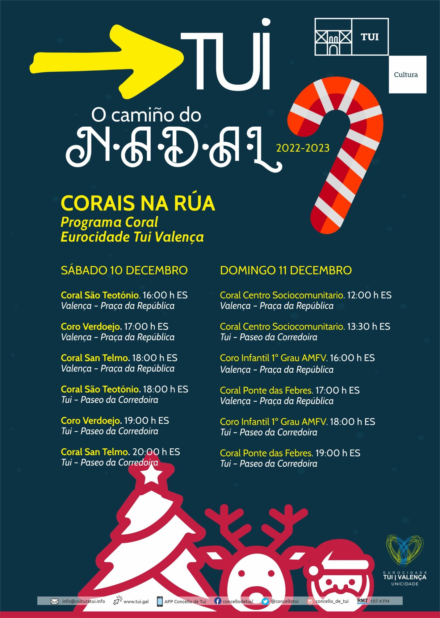 Mentres o domingo 11 a Coral Centro Sociocomunitario actuará ás 12 h na Praça da República e ás 13.30 h no Paseo da Corredoira. Xa pola tarde ás 16 h o Coro Infantil 1º Grau da Academia da Música da Fortaleza de Valença estará na Praça da República, e unha hora despois, ás 17 h, no mesmo lugar estará a Coral Ponte das Febres. Estas dúas agrupacións volverán actuar ás 18 h e ás 19 h, respectivamente no Paseo da Corredoira en Tui.