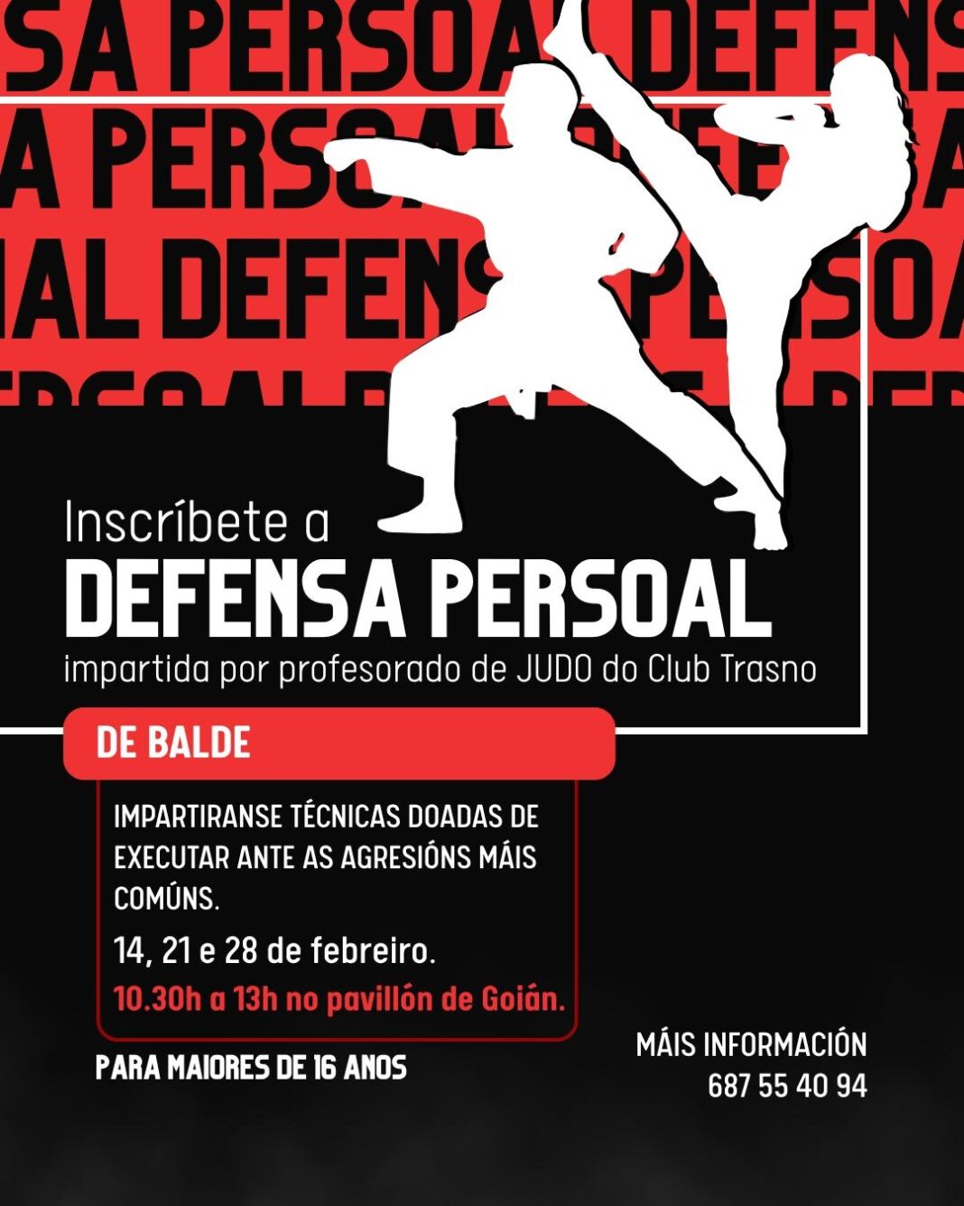 Completa esta oferta o curso de defensa persoal, organizado pola Concellería de Deportes e impartido por profesorado de judo do Club Trasno. Trátase dunha actividade práctica e realista, dirixida a maiores de 16 anos, na que se aprenderán técnicas sinxelas de executar para responder ante situacións de agresión máis comúns. As sesións celebraranse os días 14, 21 e 28 de febreiro no pavillón de Goián, en horario de 10.30 a 13.00 horas, e serán totalmente gratuítas. As persoas interesadas poden inscribirse xa na web do Concello.