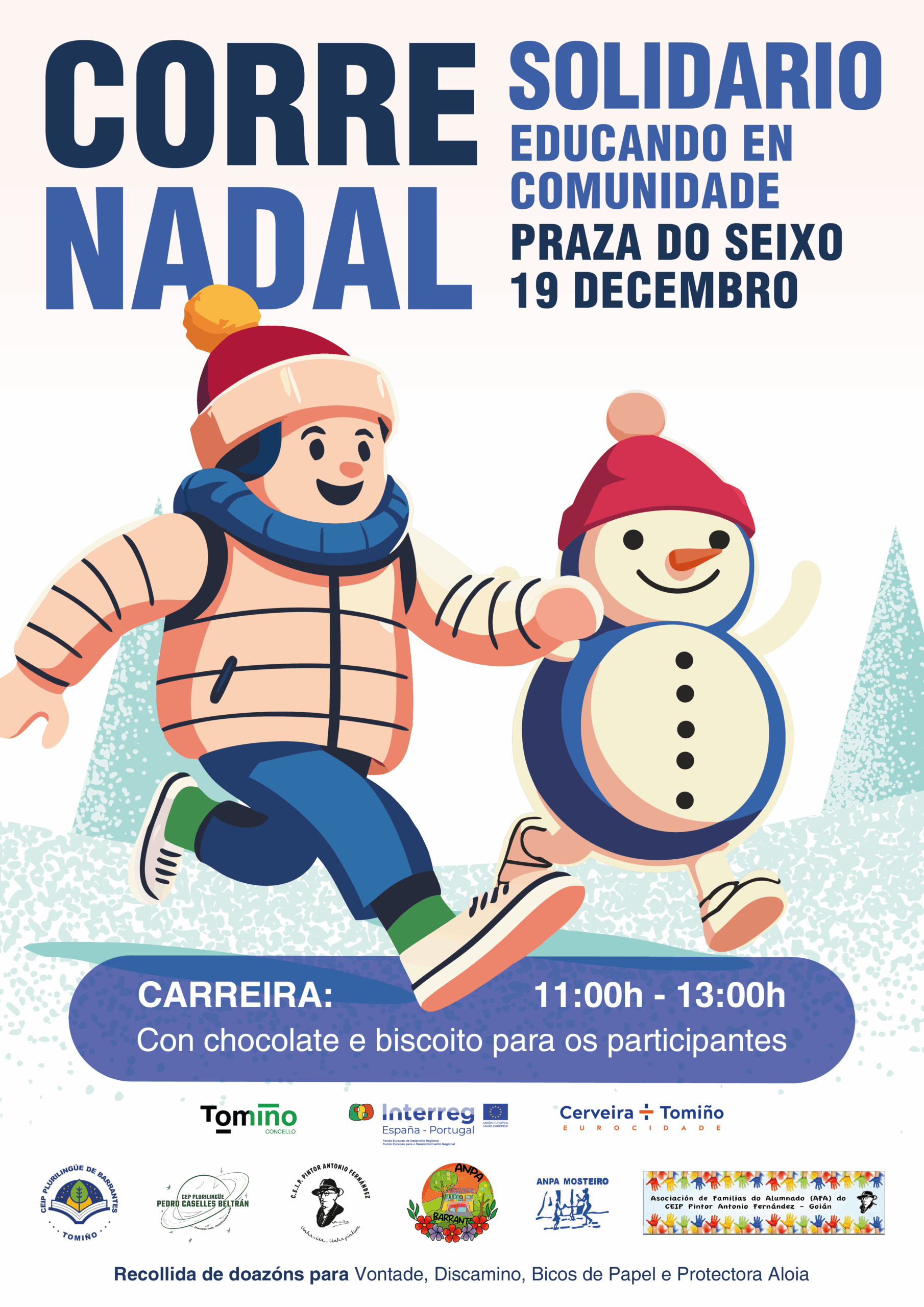 Tomiño prepárase para converter as rúas do Seixo nun circuíto de solidariedade, enerxía e comunidade no CorreNadal Solidario. O vindeiro venres 19 de decembro, o CEIP Plurilingüe de Barrantes, CEIP Pintor Antonio Fernández e CEP Plurilingüe Pedro Caselles Beltrán impulsarán unha carreira solidaria conxunta na que colaboran tamén as ANPAS, o Concello e a Eurocidade Cerveira–Tomiño, nun fin de trimestre que aposta polo deporte, a convivencia e a axuda mutua.
