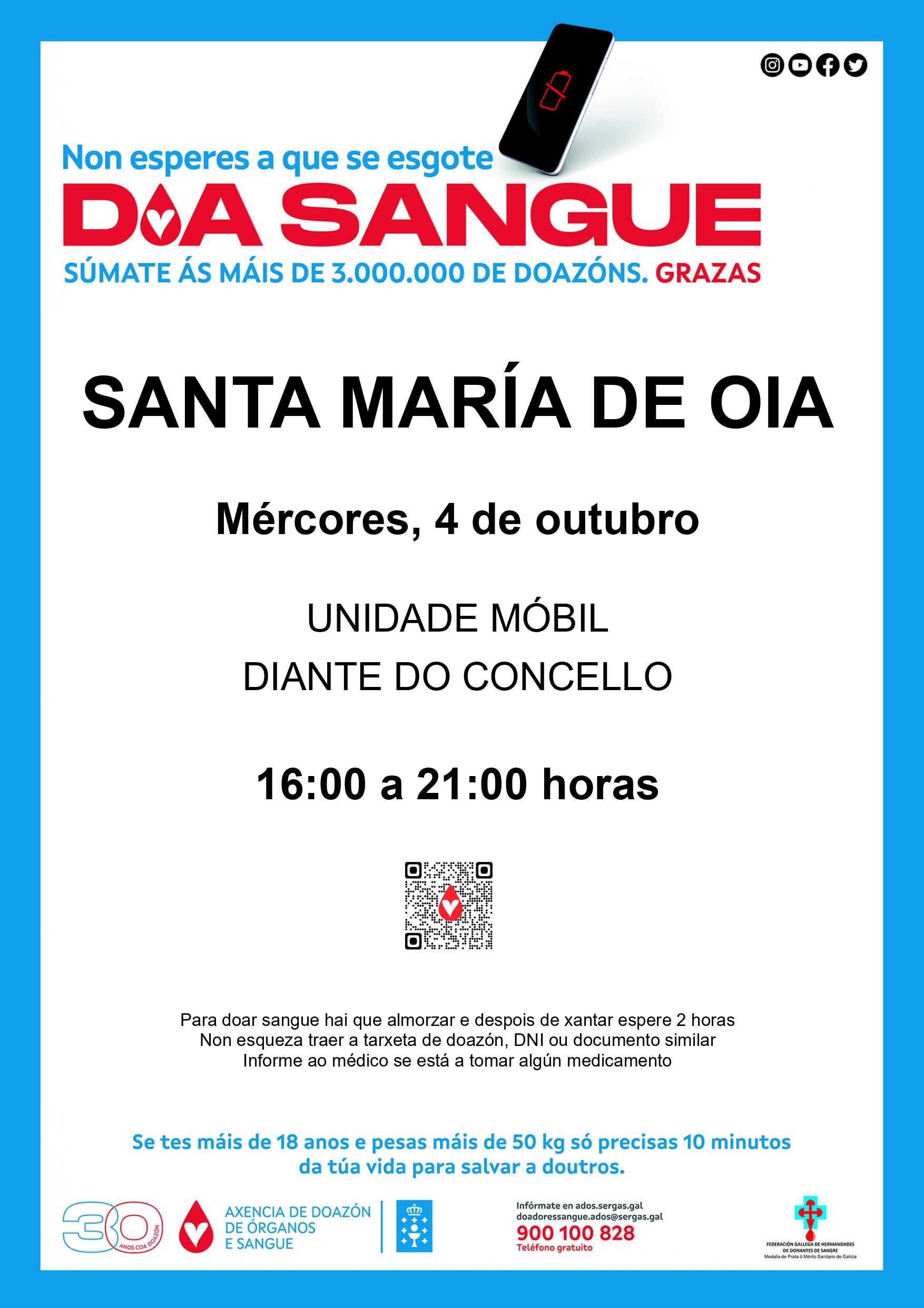 A unidade móbil de doazón de sangue visitará Oia o mércores 4 de outubro. Permanecerá aparcada diante do Concello de 16.00 a 21.00 horas, a disposición de todas as persoas que queiran achegarse.
