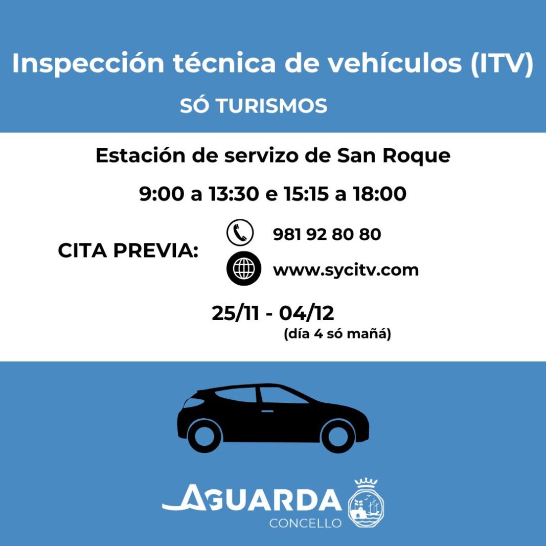 Do 25 de novembro ao 4 de decembro, realizaranse inspeccións técnicas de TURISMOS en horario de 9:00 a 13:30 horas e pola tarde de 15:15 a 18:00 horas, agás o día 4 que só se atenderá pola mañá.