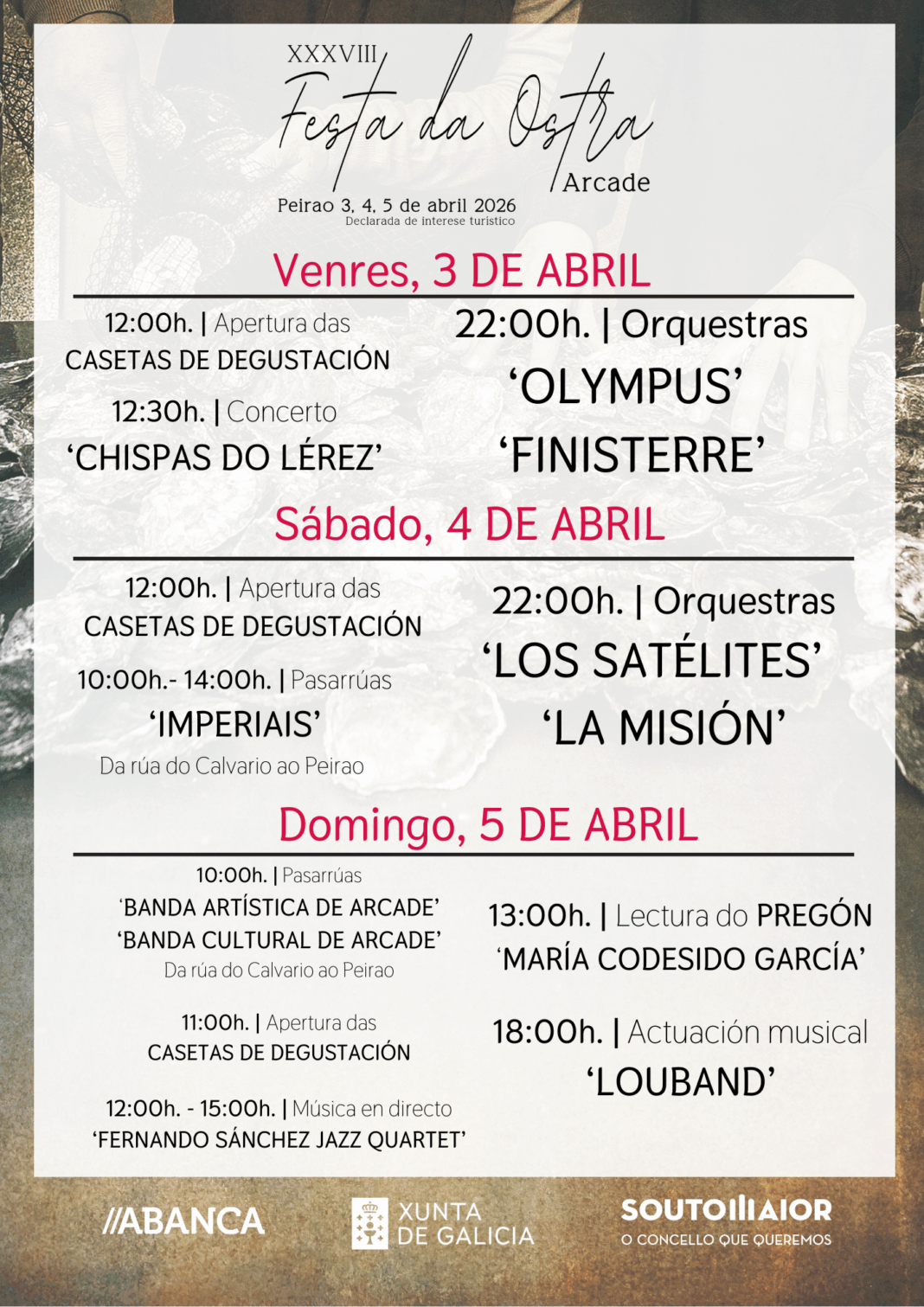 Os días 3, 4 e 5 de abril Arcade acollerá a XXXVIII edición da Festa da Ostra. Un evento realizado con moito agarimo e coidado que chegará a máis de 30 mil persoas e que contará cun programa de alto nivel que porá en valor o produto máis típico do concello de Soutomaior, concretamente da parroquia de Arcade.