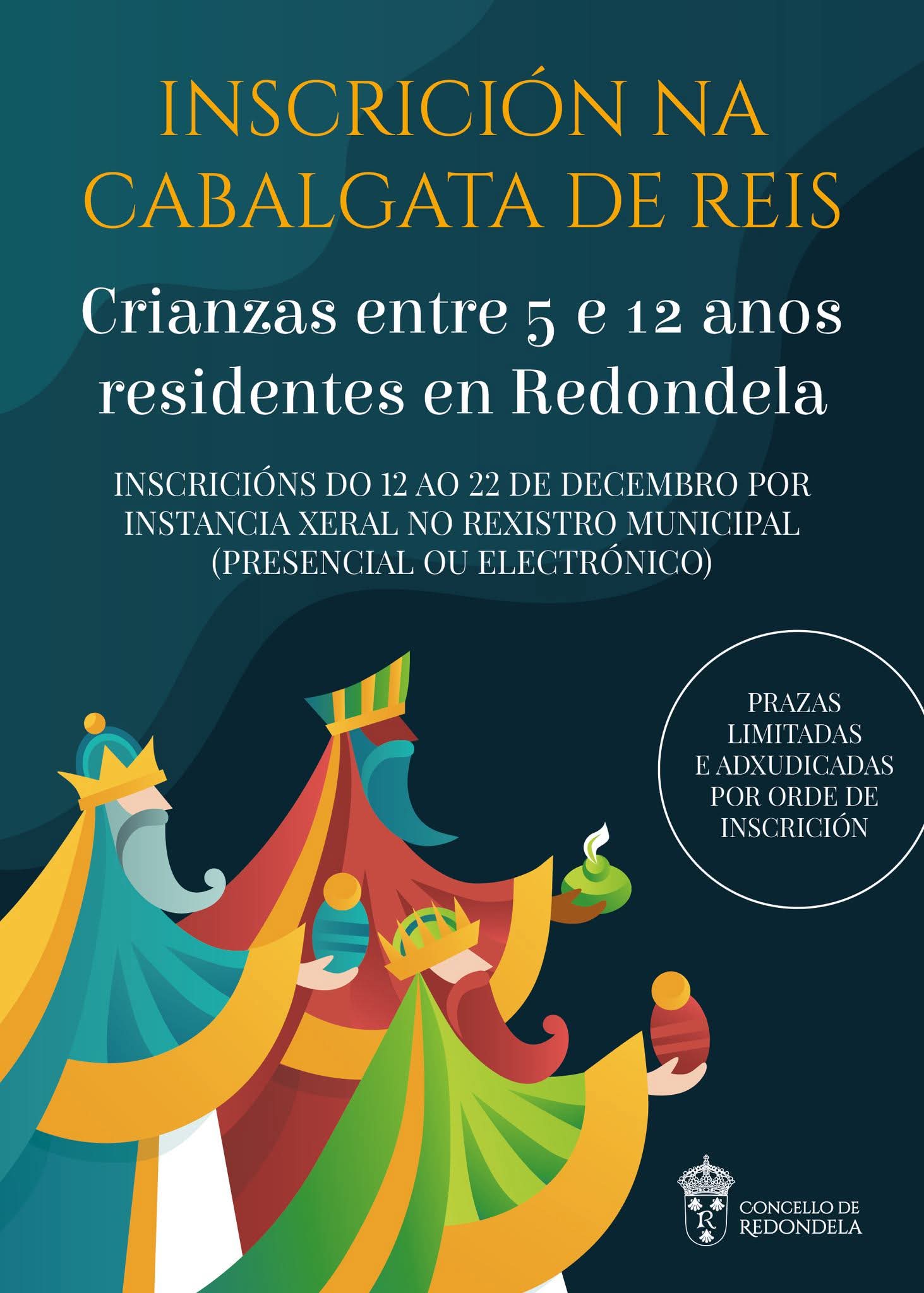 O Concello de Redondela abre o prazo de inscrición para participar na tradicional Cabalgata de Reis que se celebrará o 5 de xaneiro. Poderán participar nenos e nenas de entre 5 e 12 anos de idade residentes no municipio. O prazo de inscrición estará aberto desde o 12 ata o 22 de decembro a través dunha instancia xeral que debe presentarse no Rexistro Municipal de xeito presencial ou electrónico. As prazas son limitadas e cubriranse por orde de inscrición.