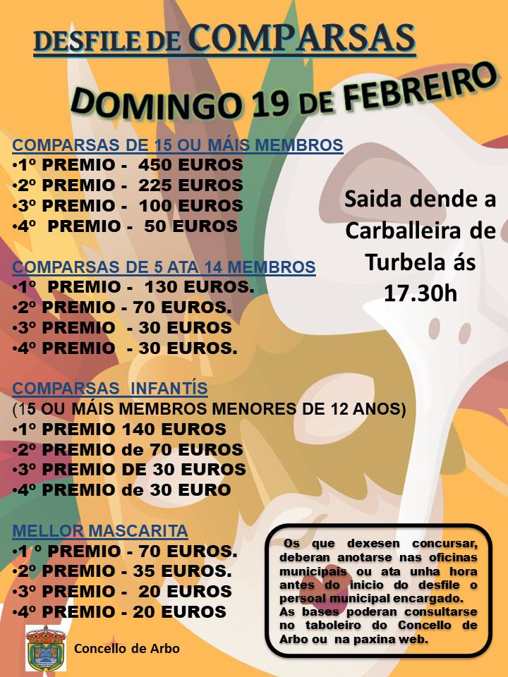Concello de Arbo convoca dentro das actividades programadas para o “Entroido 2022” un Desfile de Comparsas para o próximo día 19 de febreiro. As que desexen participan deberán anotarse nas oficinas do concello ou ata unha hora antes do inicio do desfile a través do persoal municipal identificado.