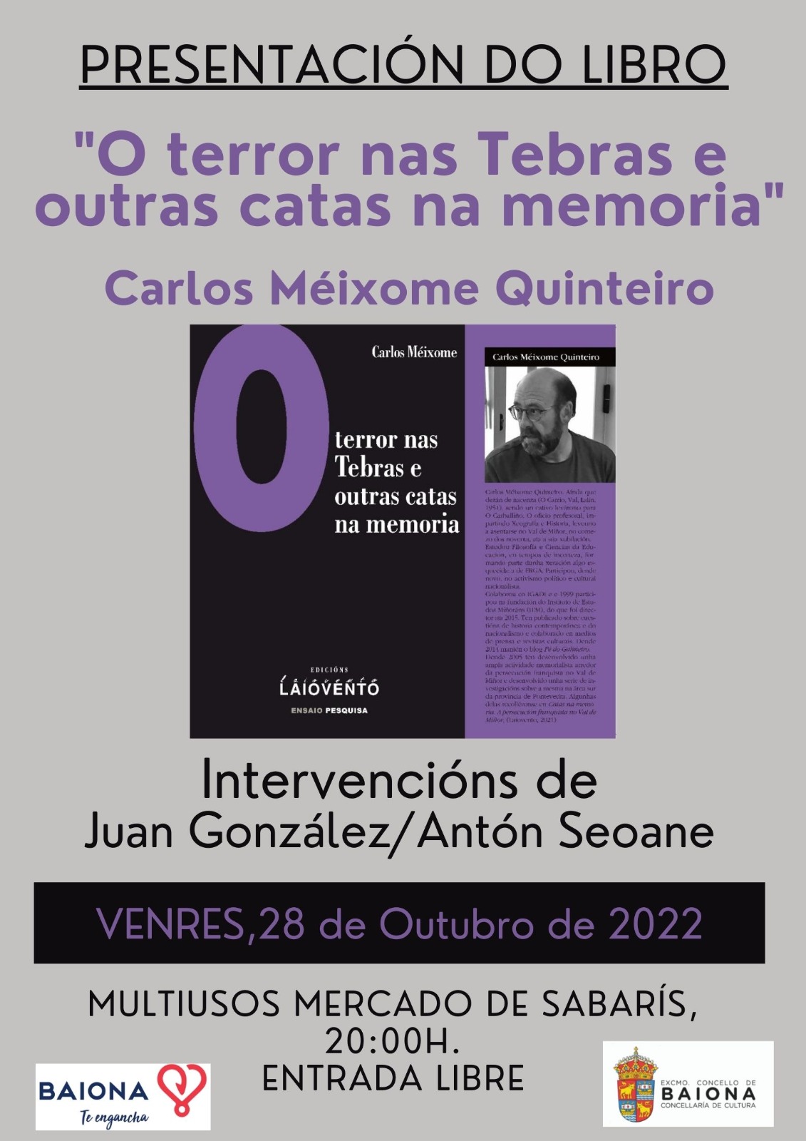 O Concello de Baiona, a través da Concellería de Cultura, clausura a programación especial polo Mes da Memoria Histórica este venres 28 de outubro ás 20:00 no Multiusos de Sabarís coa presentación do libro de Carlos Méixome Quinteiro “O Terror nas Tebras e outras catas na memoria”.