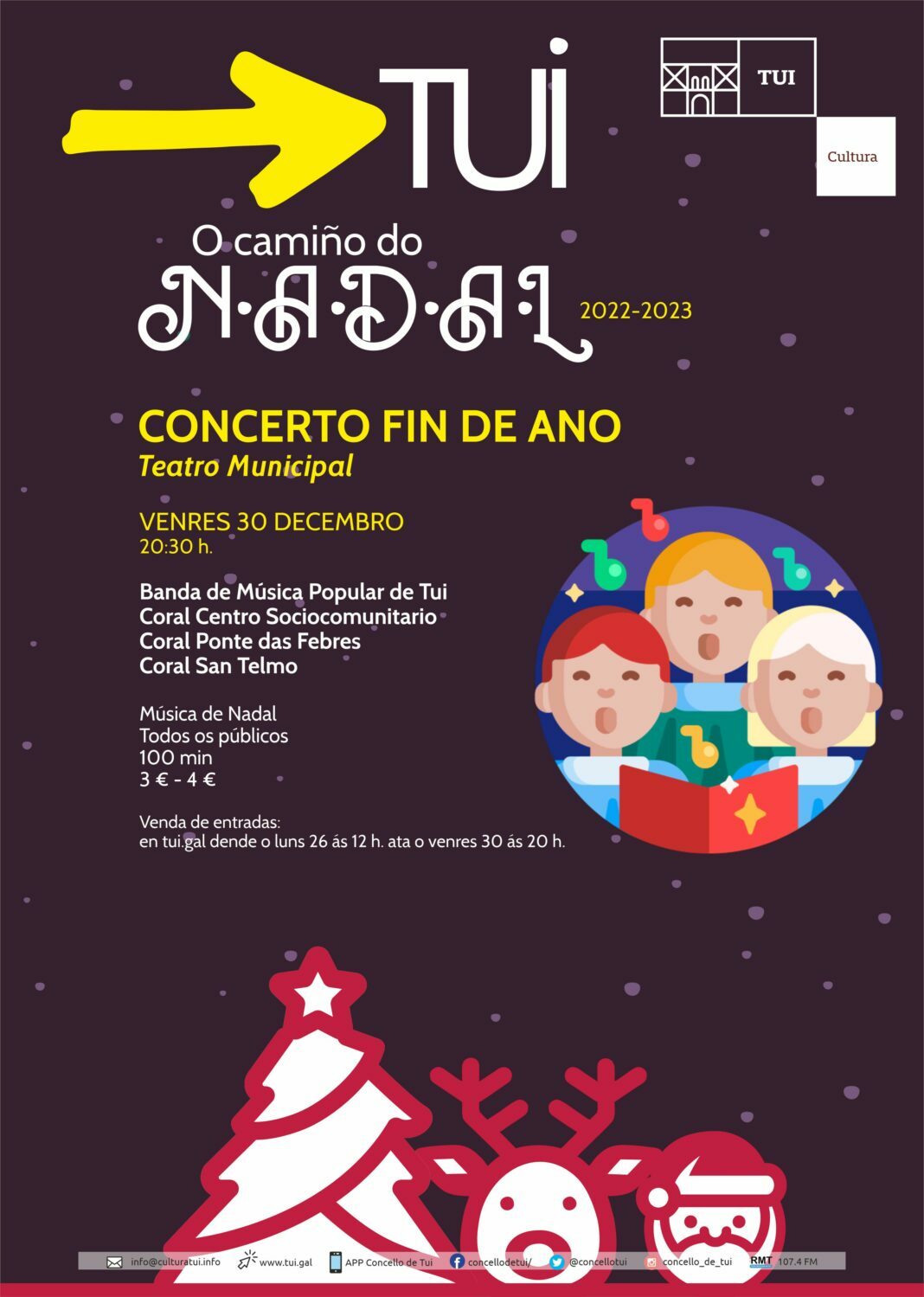 Seguindo a tradición Tui vai despedir o ano con música co Concerto de Fin de Ano que se vai celebrar este venres, 30 de decembro, ás 20.30 h no Teatro Municipal, a cargo de catro agrupacións tudenses a Banda de Música Popular de Tui, a Coral do Centro Sociocomunitario de Tui, a Coral Polifónica Ponte das Febres e a Coral San Telmo de Tui, e baixo a dirección artística de Eloy Carrera.