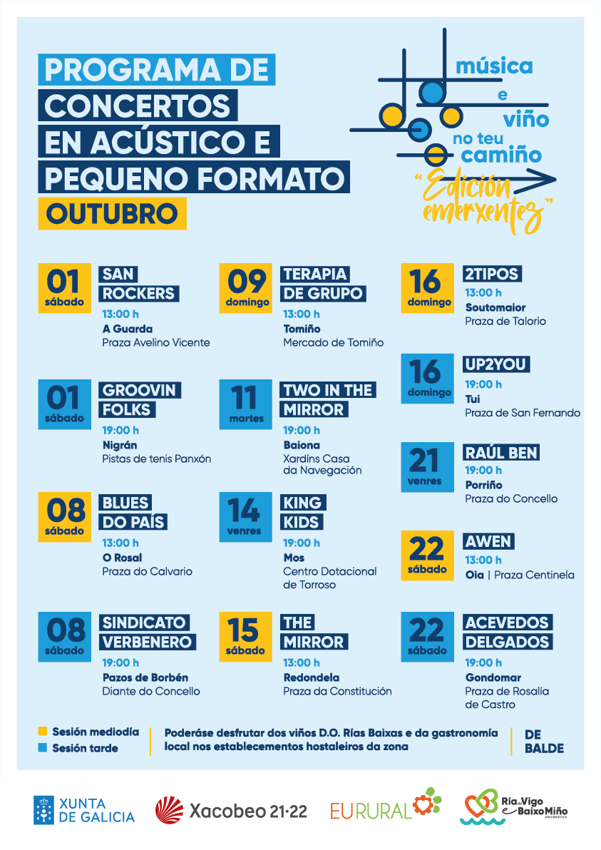 Con esta iniciativa EuRural e do Xeodestino Ría de Vigo e Baixo Miño organizan unha serie de concertos de balde por todo o territorio nos que o público poderá desfrutar da maridaxe de música, viño e gastronomía ao tempo que se potencia a hostalaría e o comercio local.