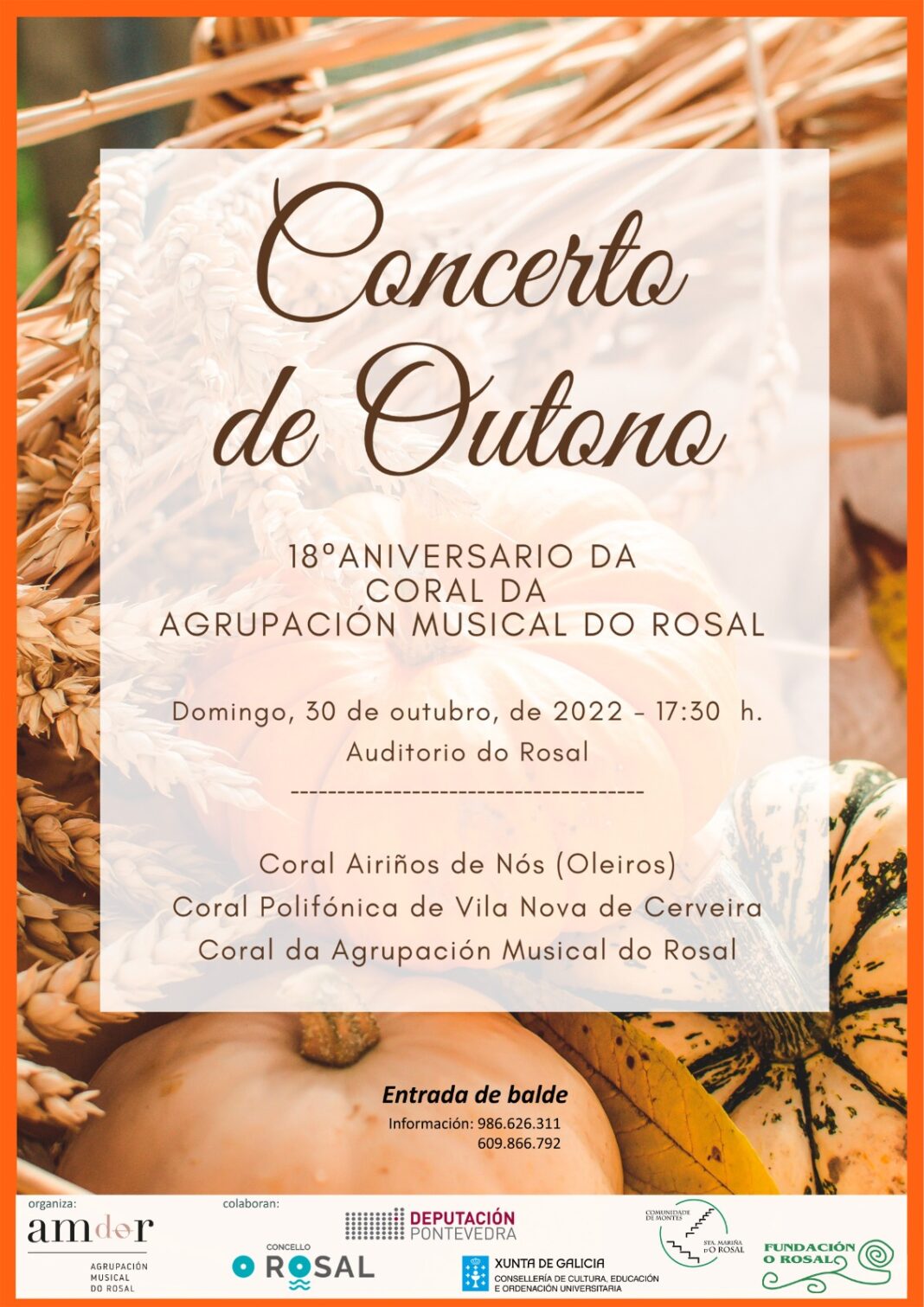 Fin de semana musical no Rosal. A Coral da Agrupación Musical do Rosal celebrará este domingo o seu 18 aniversario cun Concerto de Outono no auditorio municipal ao que convidan a asistir a toda a veciñanza.