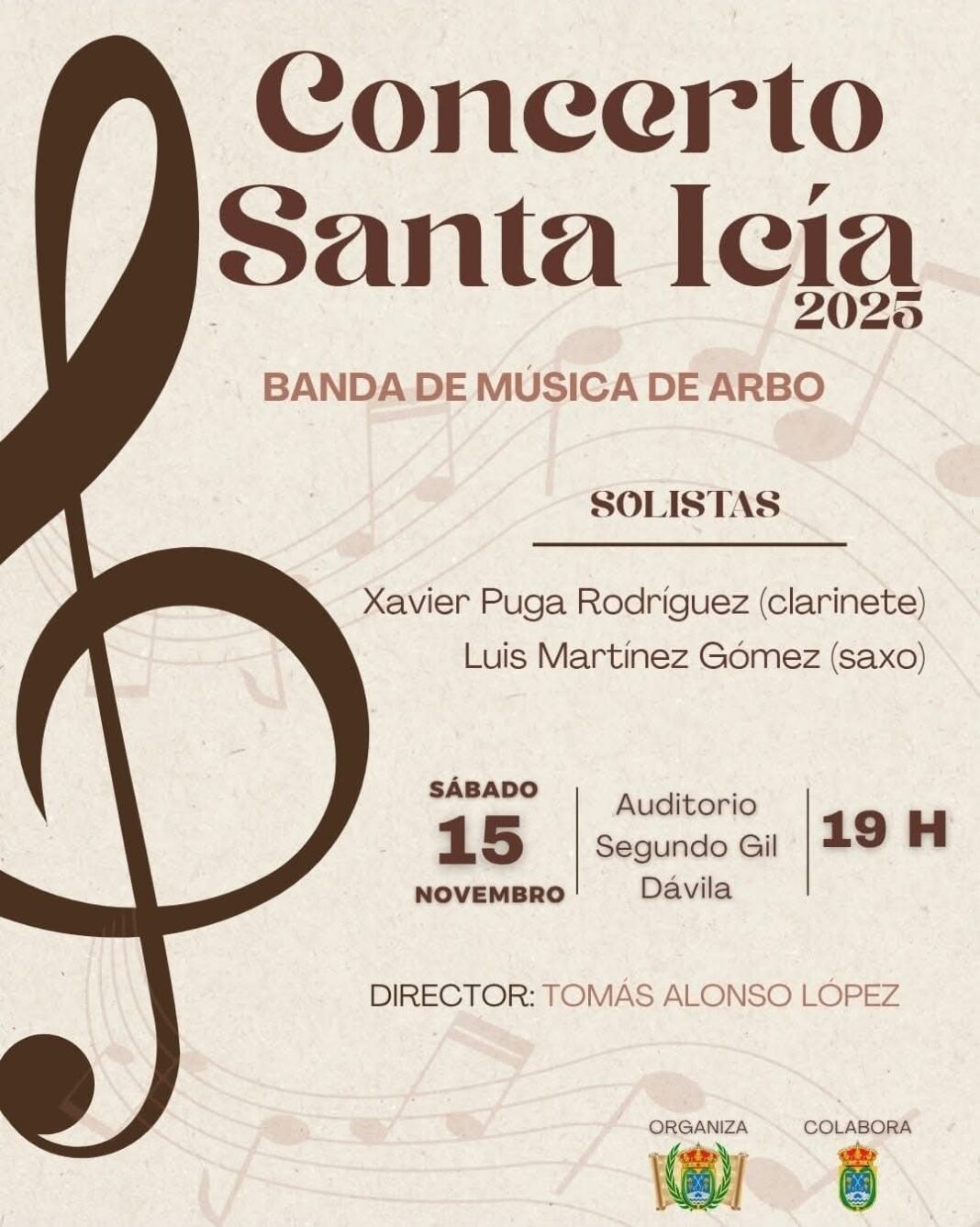 - A Banda de Música de Arbo organiza coa colaboración do Concello de Arbo un novo Concerto de Santa Icia en recoñecemento á patroa dos músicos, consolidando unha tradición que une á comunidade ao redor da música e a cultura.
