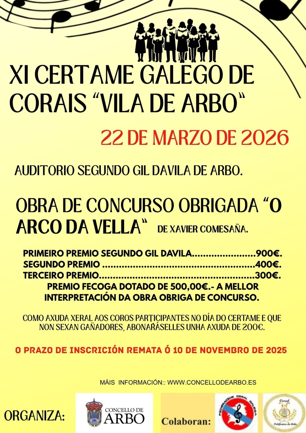 O Certame de Corais Vila de Arbo, un dos eventos máis destacados da música polifónica en Galicia, prepara a súa próxima edición programada para o 22 de marzo de 2026 no Auditorio Segundo Gil Davila de Arbo. Esta iniciativa, organizada polo Concello de Arbo en colaboración coa Coral Polifónica de Arbo e a Federación Coral Galega (FECOGA), continúa consolidándose como unha plataforma que fomenta, promociona e apoia a cultura musical coral na rexión e máis aló.