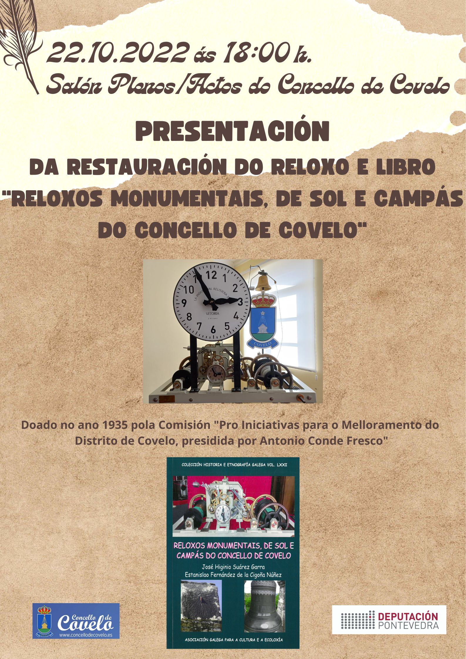Na presentación afondarán tamén na historia do reloxo que fora encargado a unha recoñecida marca de reloxería vasca pola comisión “Pro iniciativas para o melloramento do Distrito de Covelo” no ano 1935 presidida por Antonio Conde Fresco, que foi alcalde de Covelo entre os anos 1934e 1936. O reloxo foi sufragado por subscrición popular e doado ao concello pola comisión ao considerar que debía ser colocado na Casa Consistorial ao ser de “grande utilidade pública e de absoluta necesidade e trascendencia na reglamentación de toda a vida campesiña do noso pobo” segundo se pode ler na acta de doazón do 17 de maio de 1935 e que agora poderemos ler no libro que tamén se presenta este sábado.