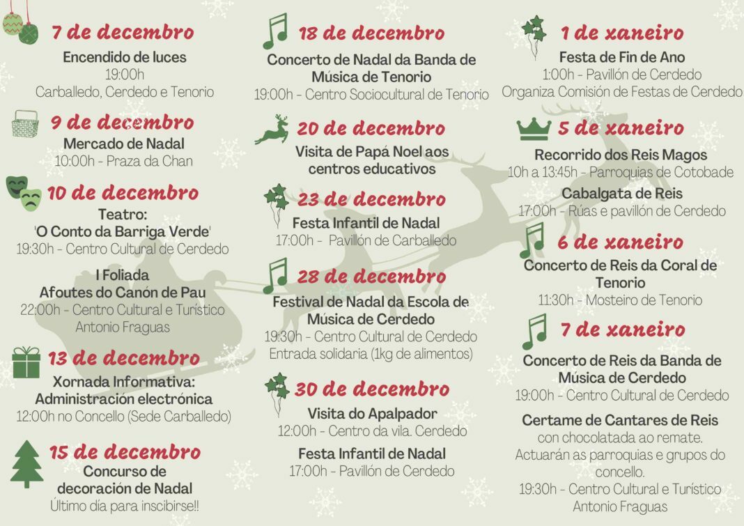 Este abano de actividades de Nadal ábrese esta noite co prendido de luces e continuará o venres 9 de decembro coa celebración do tradicional Mercado de Nadal, na Praza da Chan. O sábado día 10 tócalle o turno ao teatro da man do “Conto da Barriga Verde”, ás 19:30 horas no Centro Cultural de Cerdedo. Este mesmo sábado, pero ás 22 horas terá lugar a I Foliada Afoutes do Canón de Pau no Centro Cultural e Turístico “Antonio Fraguas”.