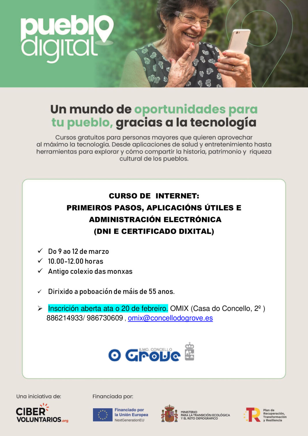 Estas accións intégranse no convenio de colaboración entre O Concello do Grove e a Fundación Cibervoluntarios, dentro do programa Pueblo Digital e financiado pola Unión Europea, que promove a adquisición de competencias dixitais adaptadas a distintos niveis, incluíndo a navegación segura por internet, o uso da e-Administración e a banca dixital.