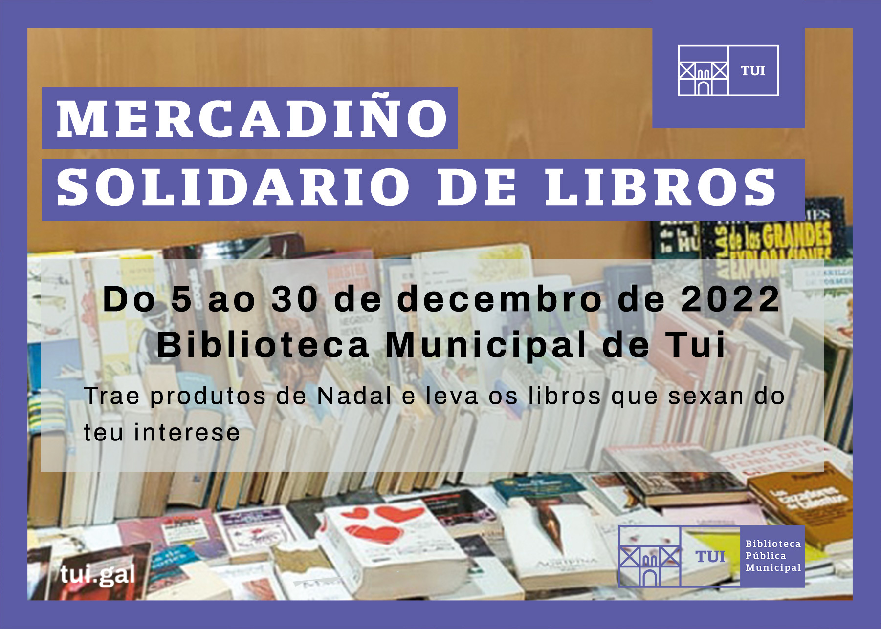 A Biblioteca Pública Municipal de Tui organiza dende hoxe luns 5 e até o venres 30 de decembro unha nova edición do mercadiño solidario de libros, en colaboración co departamento de Servizos Sociais do Concello.
