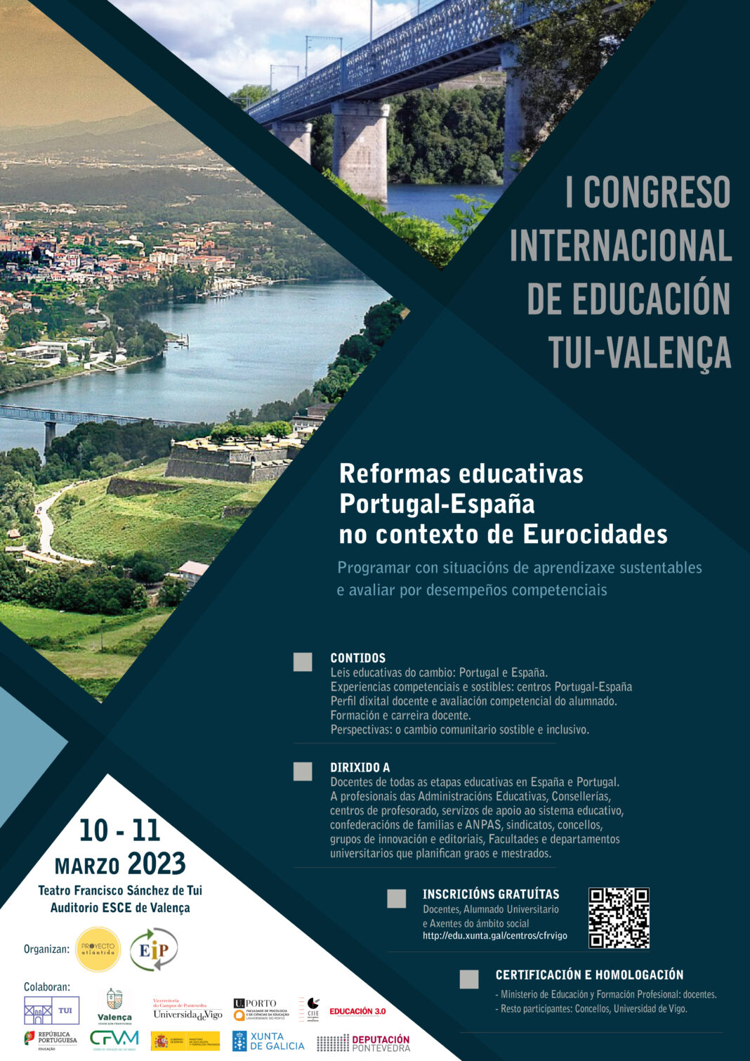 O I Congreso Internacional de Educación Tui-Valença celebrarase o venres 10 e o sábado 11 marzo na Eurocidade Tui-Valença para abordar as reformas educativas en Portugal e España. Está organizado polo grupo Atlántida e EIP-CEII, os equipos de investigación da Universidade de Porto. Neste congreso colaboran, entre outras entidades, o Concello de Tui e a Cámara Municipal de Valença, a Deputación de Pontevedra, Educación 3.0 e a Xunta de Galicia.