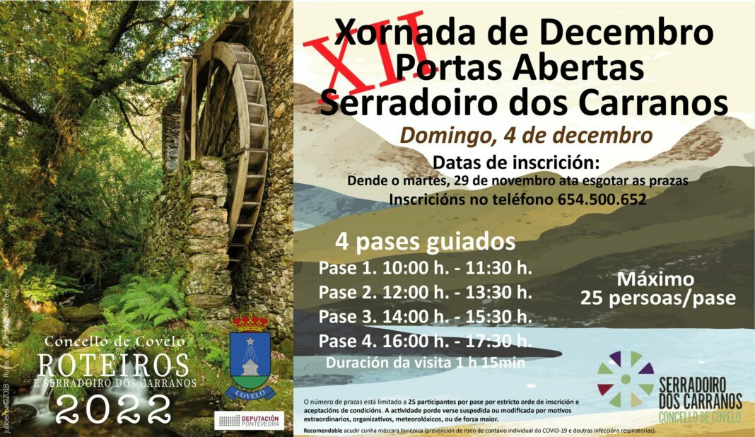 A concellería de Turismo do Concello de Covelo convida a participar nunha nova xornada de portas abertas do serradoiro dos Carranos. Será este domingo día 4 de decembro e as persoas interesadas poderán inscribirse nun dos catro pases que se realizarán. As xornadas de portas abertas no Serradoiro dos Carranos están organizadas polo Concello de Covelo e financiadas pola Deputación de Pontevedra (liña de subvención Plan Concellos) para o ano 2022. Ás visitas guiadas ao serradoiro enmárcanse na programación conxunta de promoción turística e do patrimonio cultural e natural que tamén ofrece as rutas do Museo Pazo da Cruz e as de observación das estrelas da man da Asociación Galega de Astronomía.