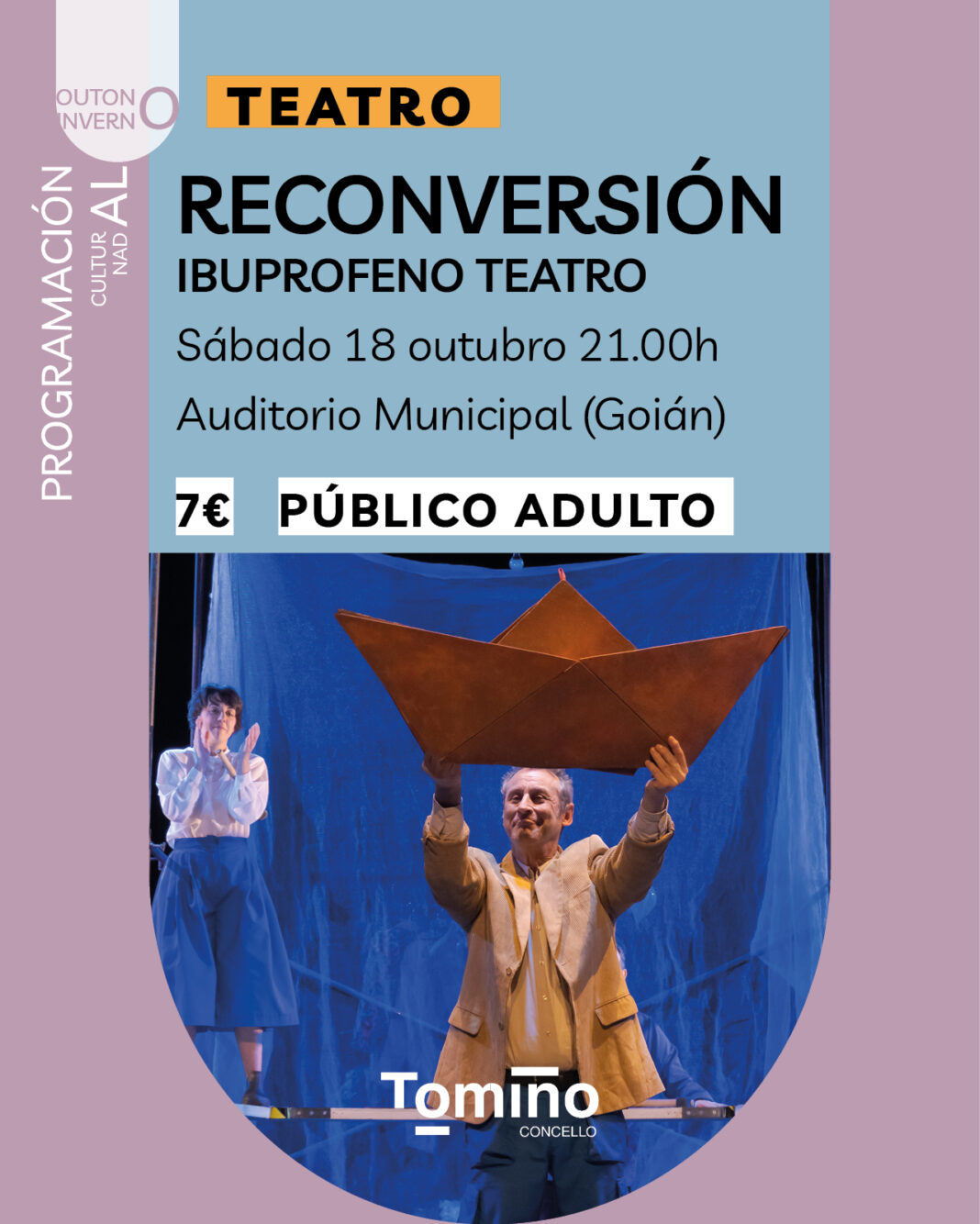 O sábado 18 de outubro será a quenda do espectáculo Reconversión, da recoñecida compañía Ibuprofeno Teatro. A proposta, dirixida a público adulto, é un exercicio de memoria histórica arredor da reconversión do sector naval na ría de Vigo, un tema que marcou a toda unha xeración. A obra afonda nas vivencias das persoas que sufriron o paro tras o peche da factoría en 1984 e que protagonizaron as mobilizacións históricas dos anos 70 e 80. Será ás 21.00 h no auditorio municipal de Goián con entradas a 7 euros.