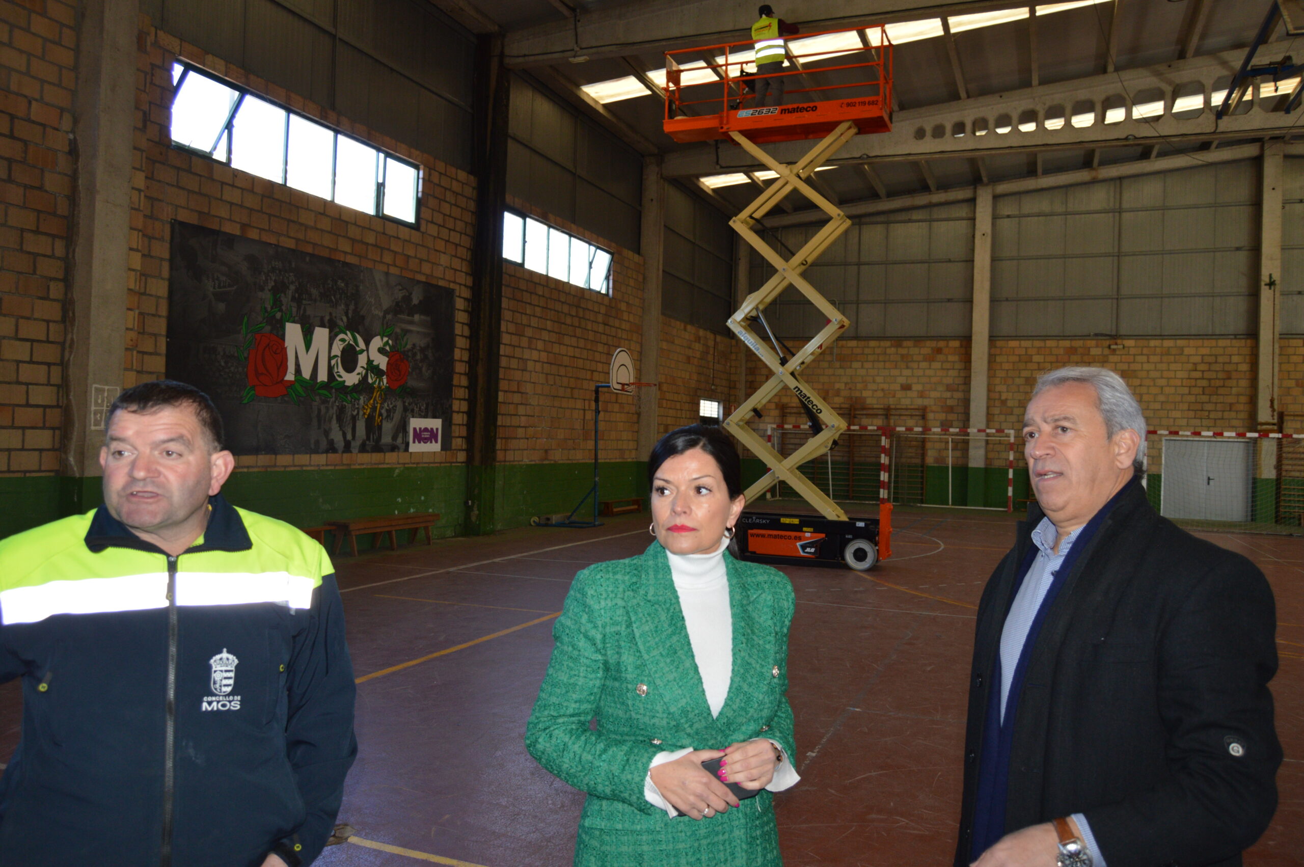 A alcaldesa de Mos, Nidia Arévalo, o concelleiro de Deportes, José Areal, e o edil mosense de Servizos, Baldomero Lorenzo, visitaron esta mañá o Pavillón de Sanguiñeda, onde o Concello de Mos está a acometer obras de mellora integral.