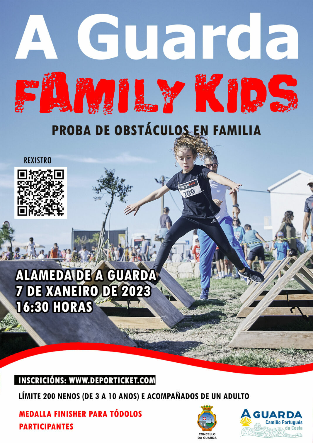 A Alameda da Guarda acolle o vindeiro sábado día 7 de xaneiro de 2023 a proba de obstáculos A Guarda Family Kids, un evento adaptado a idades de rapazas e rapaces de entre 3 e 12 anos, que deberán de ir acompañados dunha persoa adulta que tamén deberá de ir superando os distintos retos ao longo do desenrolo da proba.