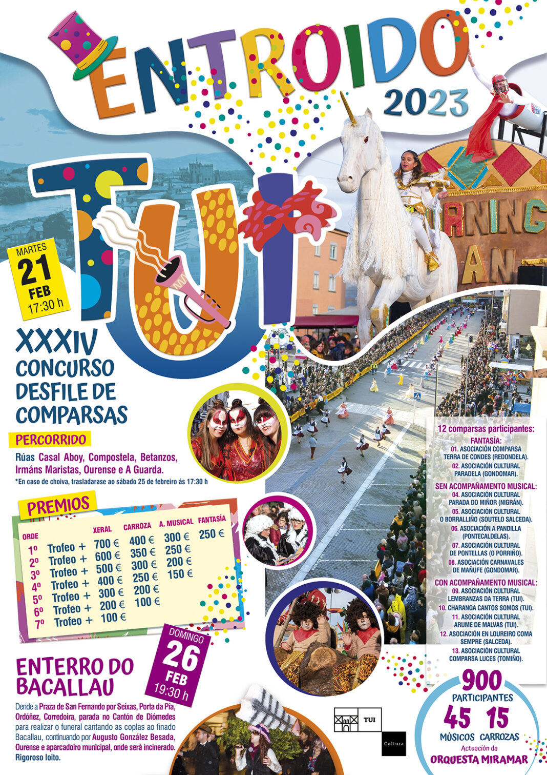 O Concello de Tui retoma con forza a súa programación de Entroido coa celebración da trixésimo cuarta edición do Concurso Desfile de Comparsas que terá lugar o próximo martes 21 de febreiro, xornada festiva local na cidade.