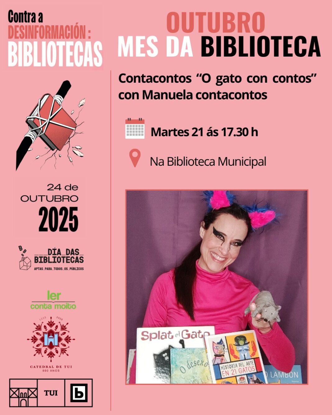 O próximo martes, 21 de outubro, continúan na Biblioteca Municipal de Tui as actividades do “Mes da Biblioteca”. Será ás 17.30 h cunha sesión de contacontos, para nenos a partir de 5 anos, a cargo de Manuela contacontos que trae o espectáculo “O gato con contos” .