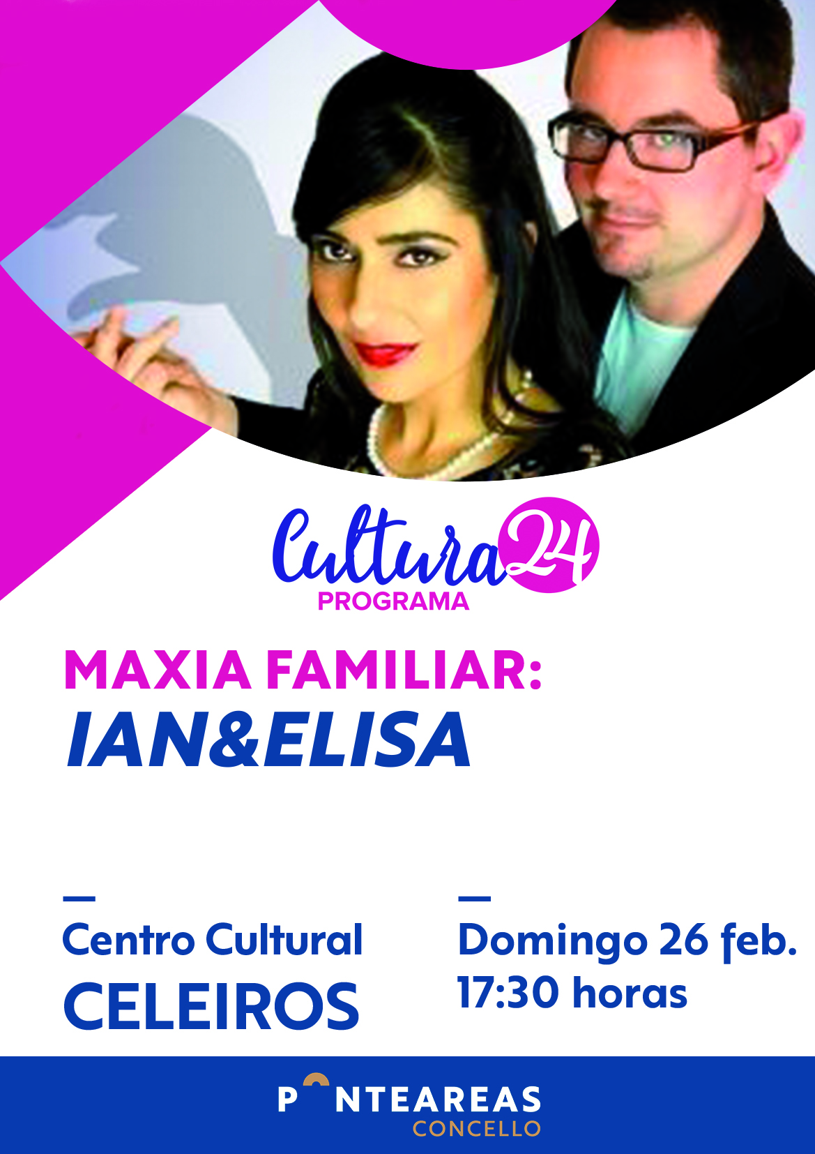 Esta fin de semana a axenda do Cultura24 chega con ‘Maxia familiar’ da man de Ian&Elisa ao Centro Cultural de Celeiros. Será un espectáculo no que maxia e ilusionismo mesturaranse con outras técnicas para mergullar a nenos, nenas e maiores nun mundo imaxinario no que nada e imposíbel. A actuación será o domingo 26 de febreiro ás 17.30 horas de balde e con entrada libre ata completar aforo.